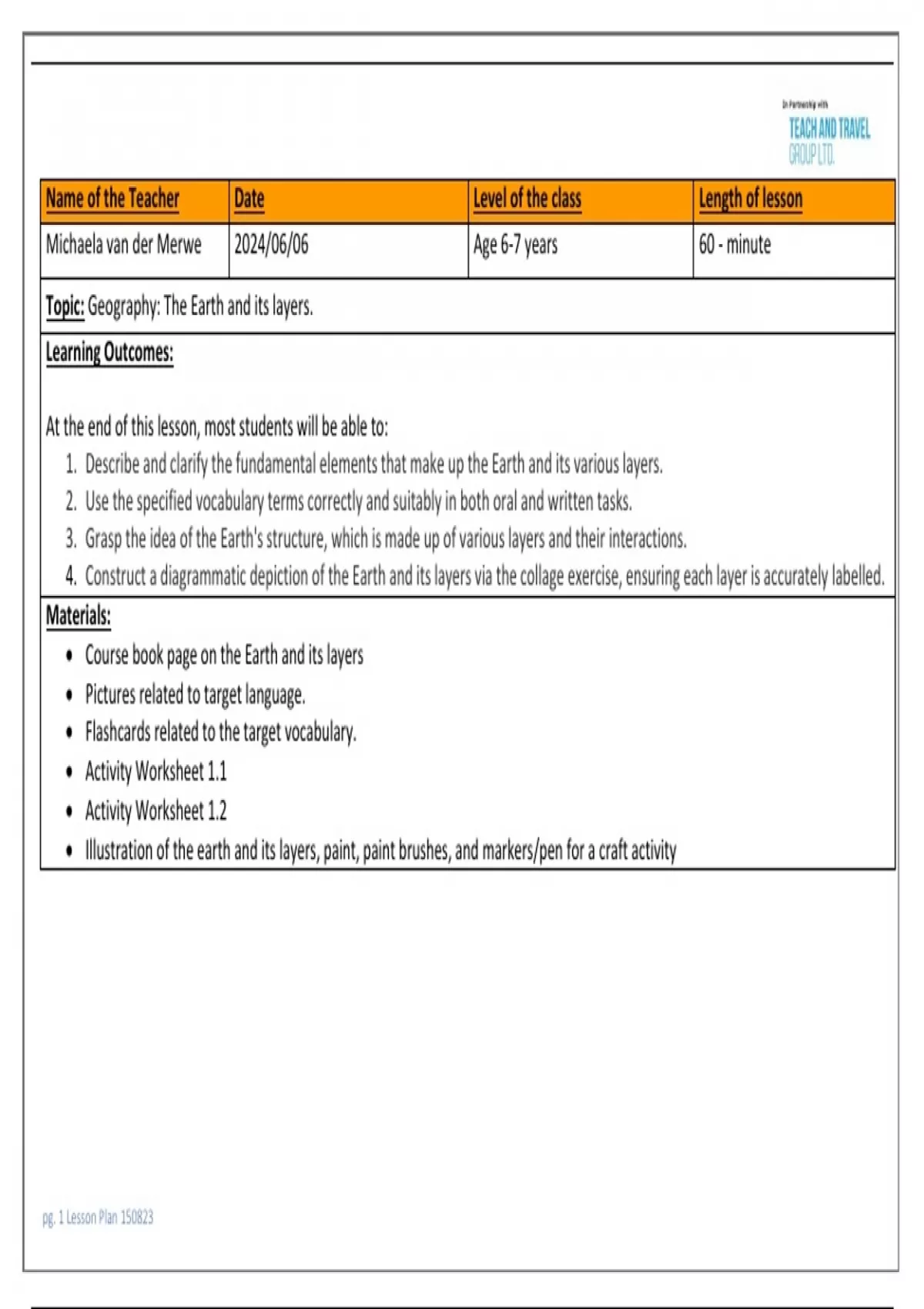 Name of the Teacher Date Level of the class Length of lesson