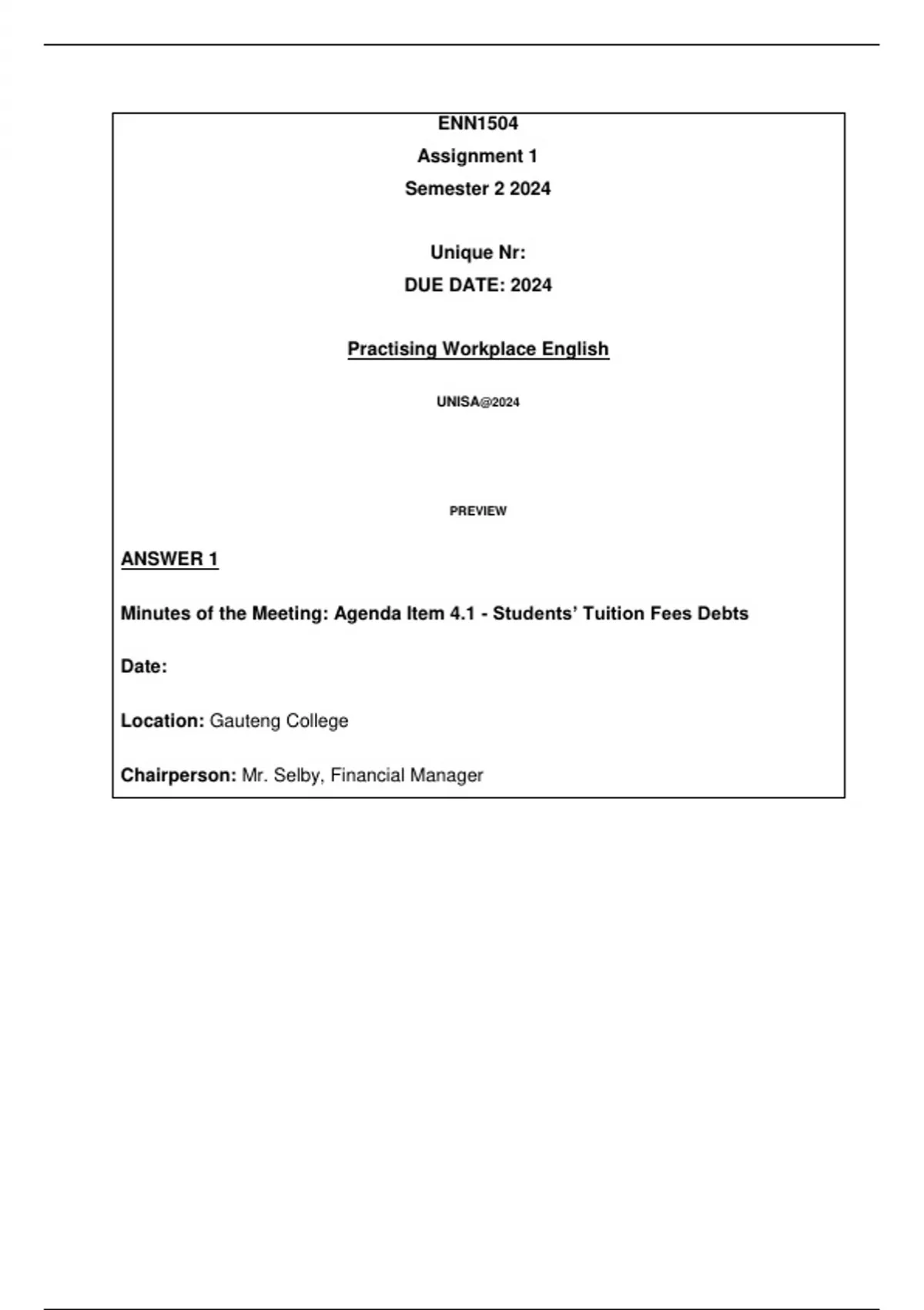 ENN1504 Assignment 1 (COMPLETE ANSWERS) Semester 2 2024 ;100 % TRUSTED workings, explanations and solutions. For assistance call or W.h.a.t.s.a.p.p us on ...(.+.2.5.4.7.7.9.5.4.0.1.3.2)........... ENN1504/02/2024 1 SEMESTER TWO ASSIGNMENT 01 NB. THIS ASSIGNMENT CONTAINS ONE MANDATORY QUESTION Submit this assignment only if you are registered for Semester 02 in 2024. This assignment should be submitted online on the Moodle platform and ensure that it is converted to a pdf file. Check that you have uploaded the correct file containing your specific assignment. The plagiarism form, available on the last page of this assignment question, should accompany this assignment. The due date for this assignment will be made available to you on the myUnisa landing page for this module. WRITING SKILLS IN WORKPLACE CORRESPONDENCE Please read the following guidelines before attempting to answer this assignment: The purpose of this question is to assess your ability to record minutes of a meeting accurately and objectively, using formal language. This requires you to do the necessary preparatory reading so that you can answer the question adequately. Work through Unit 2 in the Study Guide and Learning Unit 2 in the workbook before attempting to answer this question. QUESTION 1: MINUTES OF A MEETING BACKGROUND Most of the students at Gauteng College applied to the National Student Financial Aid Department for funding to pay tuition fees. However, not all the students received funding. As a result, they mostly owed the institution tuition fees. The college has already submitted some of the debts to the debtors’ office for further investigation. Most of the Open Rubric lOMoARcPSD| ENN1504/02/2024 2 students could be deregistered, blacklisted, or not receive their results at the end of the year if their fees are not paid in full. The Financial Manager of the college, Mr Selby, called a meeting with the College Board members, the students’ parents, and members of the Student Representative Council (SRC) to discuss different ways in which parents could be assisted to resolve their financial problems and pay tuition fees owed to the college. INSTRUCTIONS Below is a transcript (exact words written down) of what was said under the relevant agenda item that discussed non-payment of tuition fees, among other matters at a recent meeting held. As the minuting secretary of the Finance Department at Gauteng College, it is your duty to take minutes during meetings. Most of the students at Gauteng College did not qualify to be funded by the National Student Financial Aid Department and they therefore owed the institution tuition fees. The institution tried to come up with different ways of assisting students and parents to resolve their financial problems and pay tuition fees. The matter was discussed under agenda item 4.1. Students’ tuition fees debts. Write the minutes for agenda item 4.1 only. This means that the complete format for minutes is not required. Remember that in taking minutes, we carefully select and summarise information, and make changes to style and grammar. Note that you should not record what each person said in turn. You should use the linear format of minutes (in sentences and paragraphs). Your answer should not exceed ONE page in length. TRANSCRIPT Mr Selby (Chair): Ladies and gentlemen, we have so far addressed most of the crucial issues that are affecting the broader society and our immediate families, such as high student drop-out and failure rates. We are all aware of our country’s declining economy especially after the outbreak of Covid19, load shedding and the high level of corruption in the country. Most members of our households are unemployed as a result. The socio-economic decline of the country directly or lOMoARcPSD| ENN1504/02/2024 3 indirectly affects the smooth running of some institutions of learning like ours, which depends on the tuition fees paid by the parents. I am aware that most of the students applied for funding through the National Student Financial Aid Department. Unfortunately, not all our students were lucky enough to get approval and receive the funding. About 60% of the students, therefore, owe their tuition fees. This makes it very difficult for the college to sustain itself because it is through the tuition fees that a lot of debts are covered, including electricity and water bills. The lecturers employed on fixed-term contracts get paid through the tuition fees. Resources such as computers, library books, sport equipment, to name a few, are purchased through that money as well. Without tuition fees, the institution cannot survive. The challenge we are faced with is, how can we help each other to resolve the students’ debts to sustain the institution? I therefore suggest that we discuss agenda item 4.1: Students’ tuition fees debts. Mr Moss: Thank you very much, Chair. The College Board acknowledges the financial struggles that the parents are going through. It is just unfortunate that the National Students’ Financial Aid Department is unable to fund every applicant for various reasons. Thus far, the College Board has recommended that some of the debtors be handed over to the credit bureau for further investigations. Ms Small: Ladies and gentlemen! Finances are a very sensitive topic. Most of us parents are really trying hard to make payments, but like you already said, Chair, it is such a struggle. One of the reasons why I, and maybe most of us parents, struggle to pay our children’s tuition fees is that we are over-indebted. I heard about debt counselling over the radio and TV and visited one of the National Credit offices to find out if I could not get assistance with debtlOMoARcPSD| ENN1504/02/2024 4 counselling and advice on how to meet my debt repayments. The counsellor explained the process of how an over-indebted consumer can apply for his/her debt to be restructured so that he or she could pay household expenses and still be able to pay off