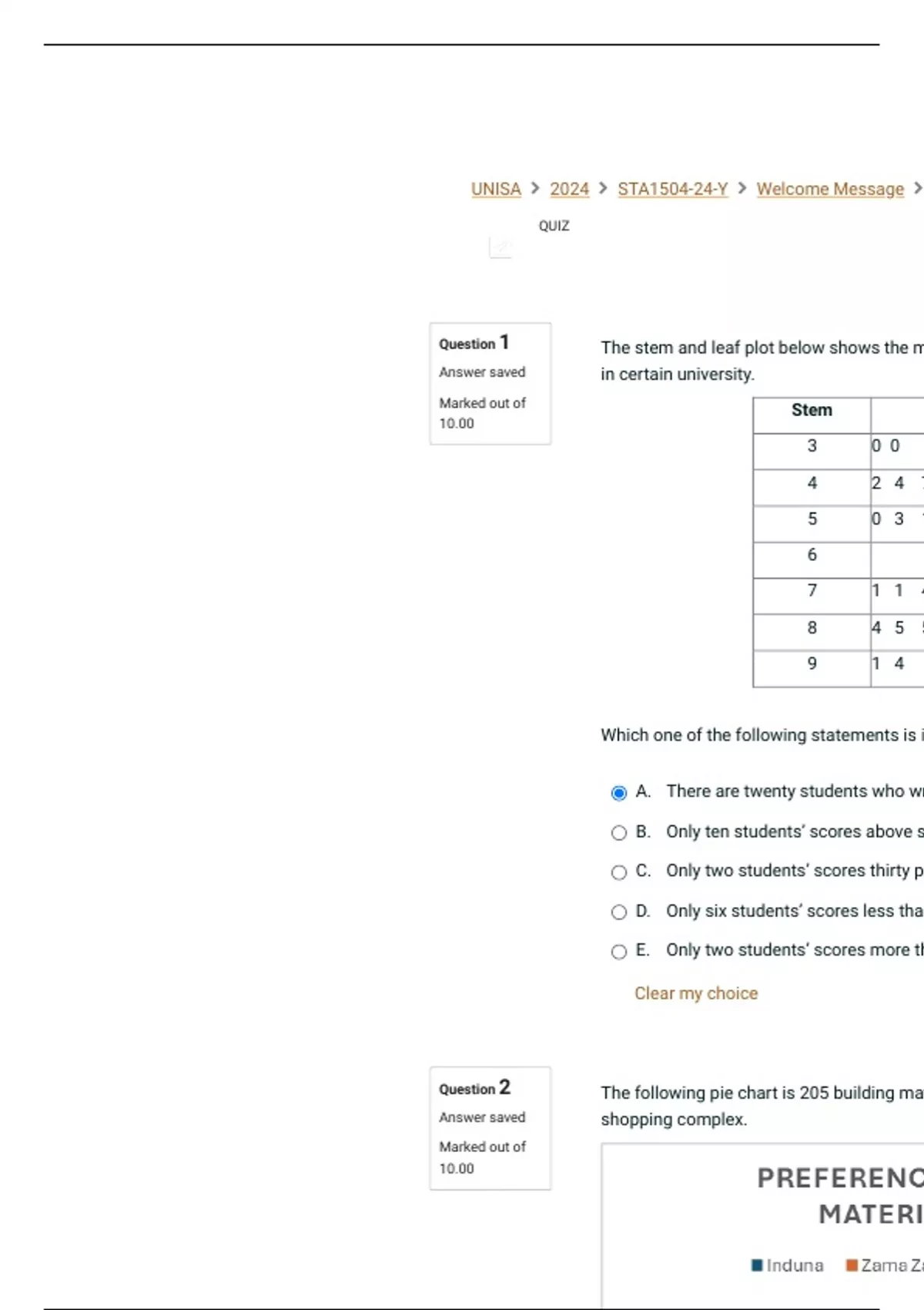Question 1 The stem and leaf plot below shows the m