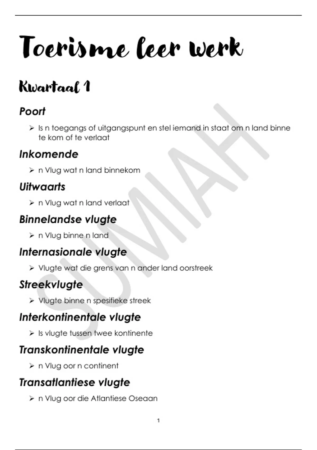 summary of term 1 and 2 of tourism it is in Afrikaans