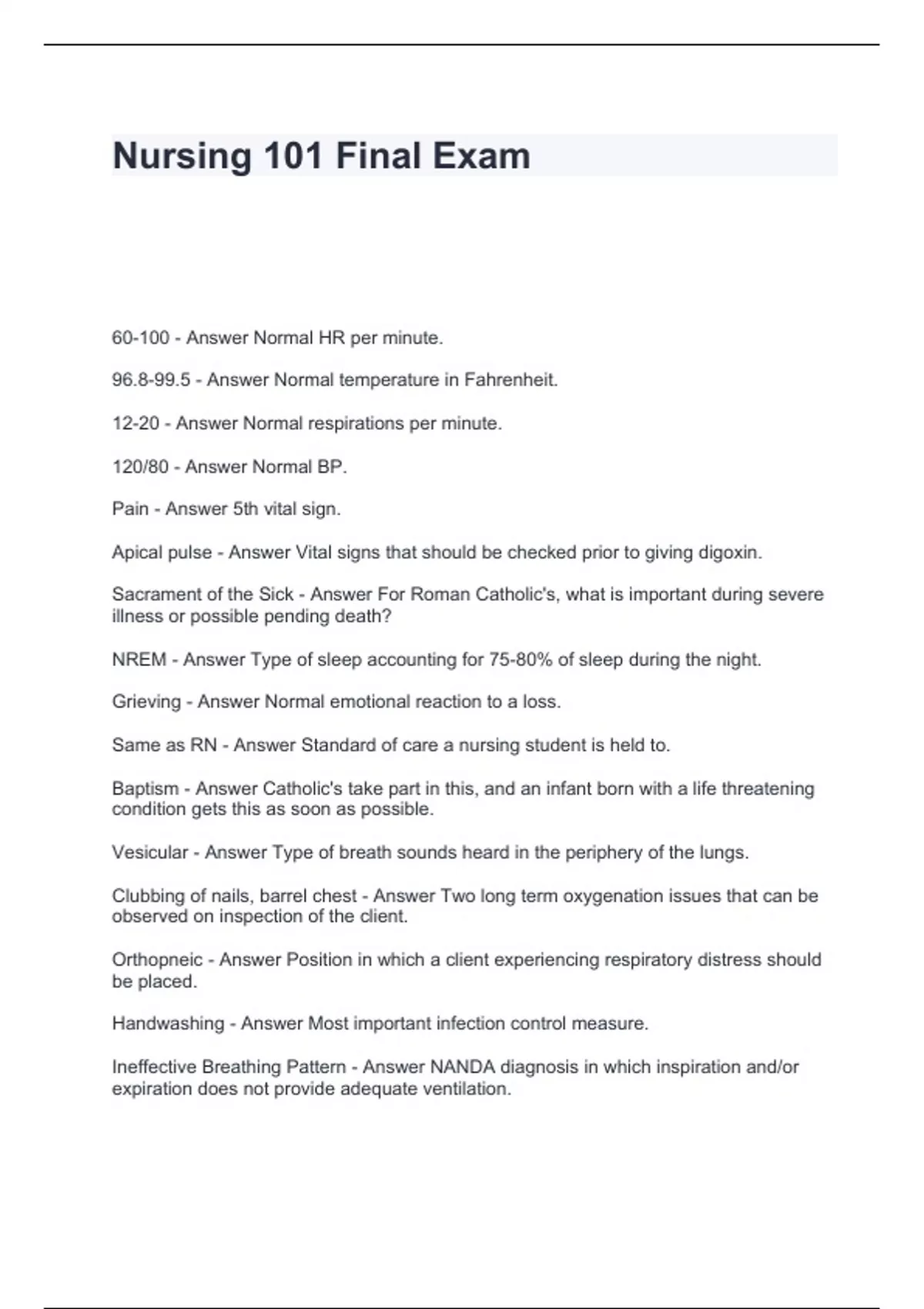 nursing 101 final exam questions with 100 correct