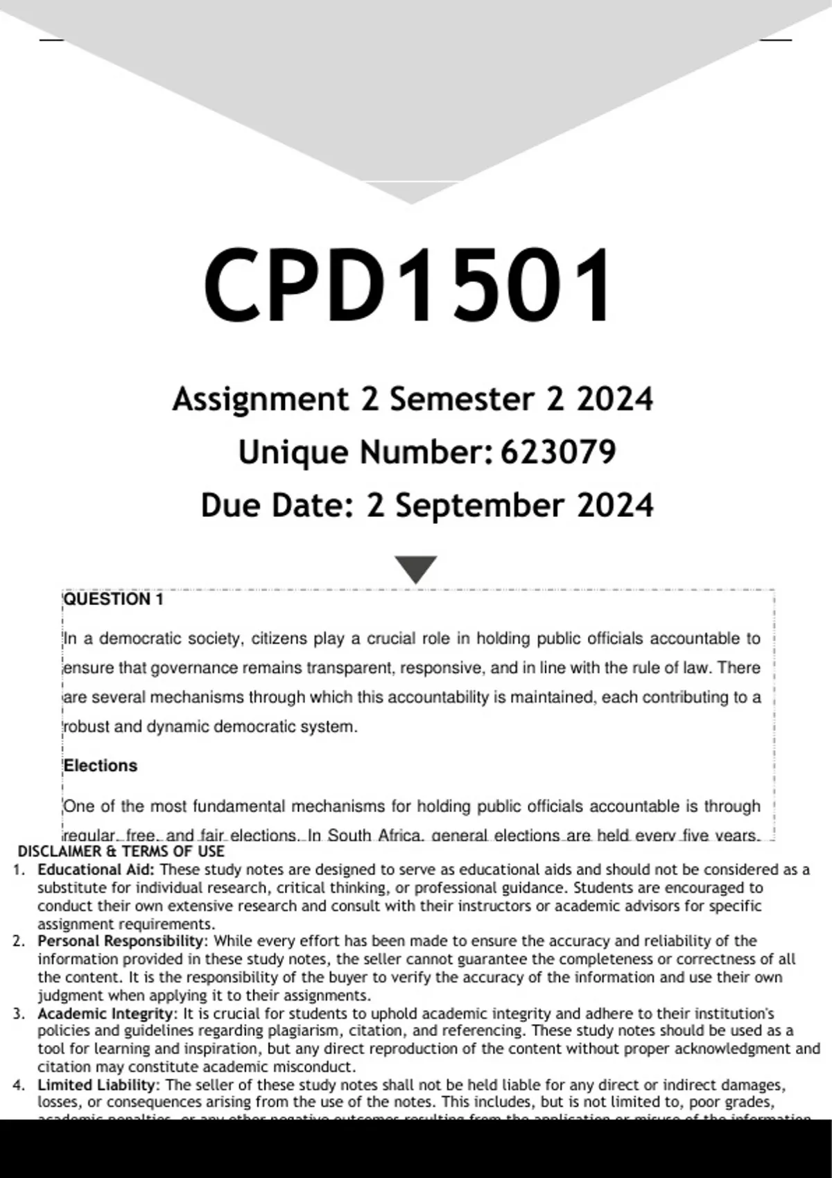 Well-structured CPD1501 Assignment 2 (ANSWERS) Semester 2 2024 - DISTINCTION GUARANTEED. (DETAILED ANSWERS - DISTINCTION GUARANTEED!)..... Question 1 How can citizens hold public officials accountable in a democratic society? Provide examples of accountability mechanisms in South Africa. (25) Question 2 What is the role of education in promoting citizenship, democracy, and public participation? Provide examples of how education can be used to promote these values.