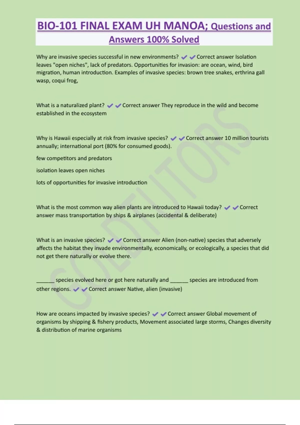 BIO-101 FINAL EXAM UH MANOA; Questions and Answers 100% Solved Why are invasive species successful in new environments? Correct answer Isolation leaves "open niches", lack of predators. Opportunities for invasion: are ocean, wind, bird migration, human introduction. Examples of invasive species: brown tree snakes, erthrina gall wasp, coqui frog, What is a naturalized plant? Correct answer They reproduce in the wild and become established in the ecosystem Why is Hawaii especially at risk from invasive species? Correct answer 10 million tourists annually; international port (80% for consumed goods). few competitors and predators isolation leaves open niches lots of opportunities for invasive introduction