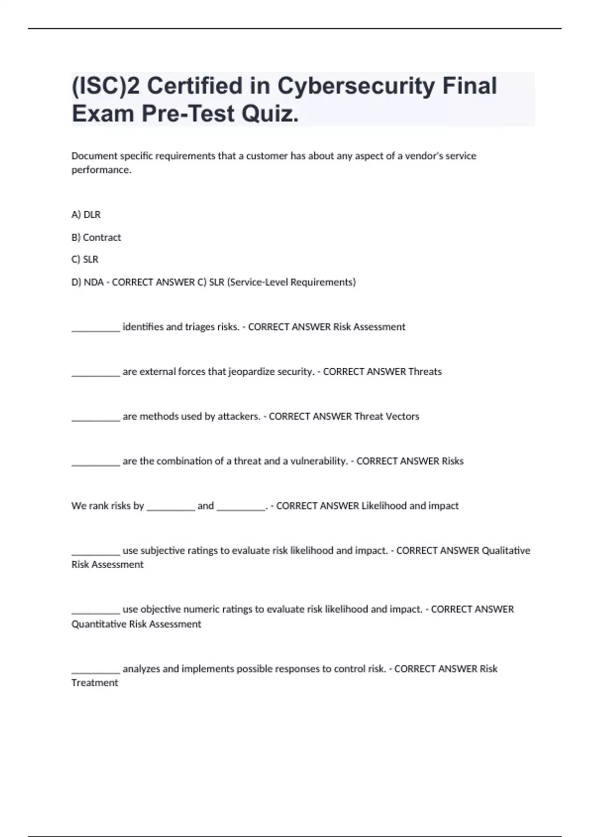 (ISC)2 Certified in Cybersecurity Final Exam Pre-Test Quiz. Document specific requirements that a customer has about any aspect of a vendor's service performance. A) DLR B) Contract C) SLR D) NDA - CORRECT ANSWER C) SLR (Service-Level Requirements) _________ identifies and triages risks. - CORRECT ANSWER Risk Assessment _________ are external forces that jeopardize security. - CORRECT ANSWER Threats _________ are methods used by attackers. - CORRECT ANSWER Threat Vectors _________ are the combination of a threat and a vulnerability. - CORRECT ANSWER Risks We rank risks by _________ and _________. - CORRECT ANSWER Likelihood and impact _________ use subjective ratings to evaluate risk likelihood and impact. - CORRECT ANSWER Qualitative Risk Assessment _________ use objective numeric ratings to evaluate risk likelihood and impact. - CORRECT ANSWER Quantitative Risk Assessment _________ analyzes and implements possible responses to control risk. - CORRECT ANSWER Risk Treatment _________ changes business practices to make a risk irrelevant. - CORRECT ANSWER Risk Avoidance _________ reduces the likelihood or impact of a risk. - CORRECT ANSWER Risk Mitigation An organization's _________ is the set of risks that it faces. - CORRECT ANSWER Risk Profile _________ Initial Risk of an organization. - CORRECT ANSWER Inherent Risk _________ Risk that remains in an organization after controls. - CORRECT ANSWER Residual Risk _________ is the level of risk an organization is willing to accept. - CORRECT ANSWER Risk Tolerance _________ reduce the likelihood or impact of a risk and help identify issues. - CORRECT ANSWER Security Controls _________ stop a security issue from occurring. - CORRECT ANSWER Preventive Control _________ identify security issues requiring investigation. - CORRECT ANSWER Detective Control _________ remediate security issues that have occurred. - CORRECT ANSWER Recovery Control Hardening == Preventative - CORRECT ANSWER Virus == Detective Backups == Recovery - CORRECT ANSWER For exam (Local and Technical Controls are the same) _________ use technology to achieve control objectives. - CORRECT ANSWER Technical Controls _________ use processes to achieve control objectives. - CORRECT ANSWER Administrative Controls