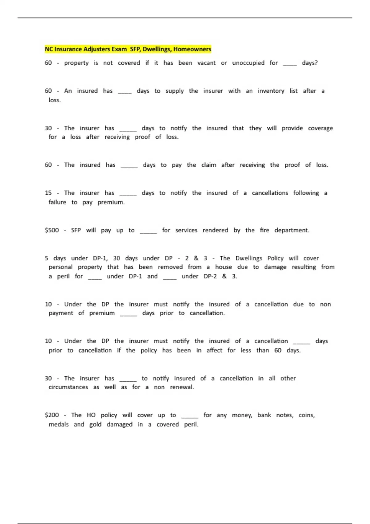NC Insurance Adjusters Exam (SFP, Dwellings, Homeowners)