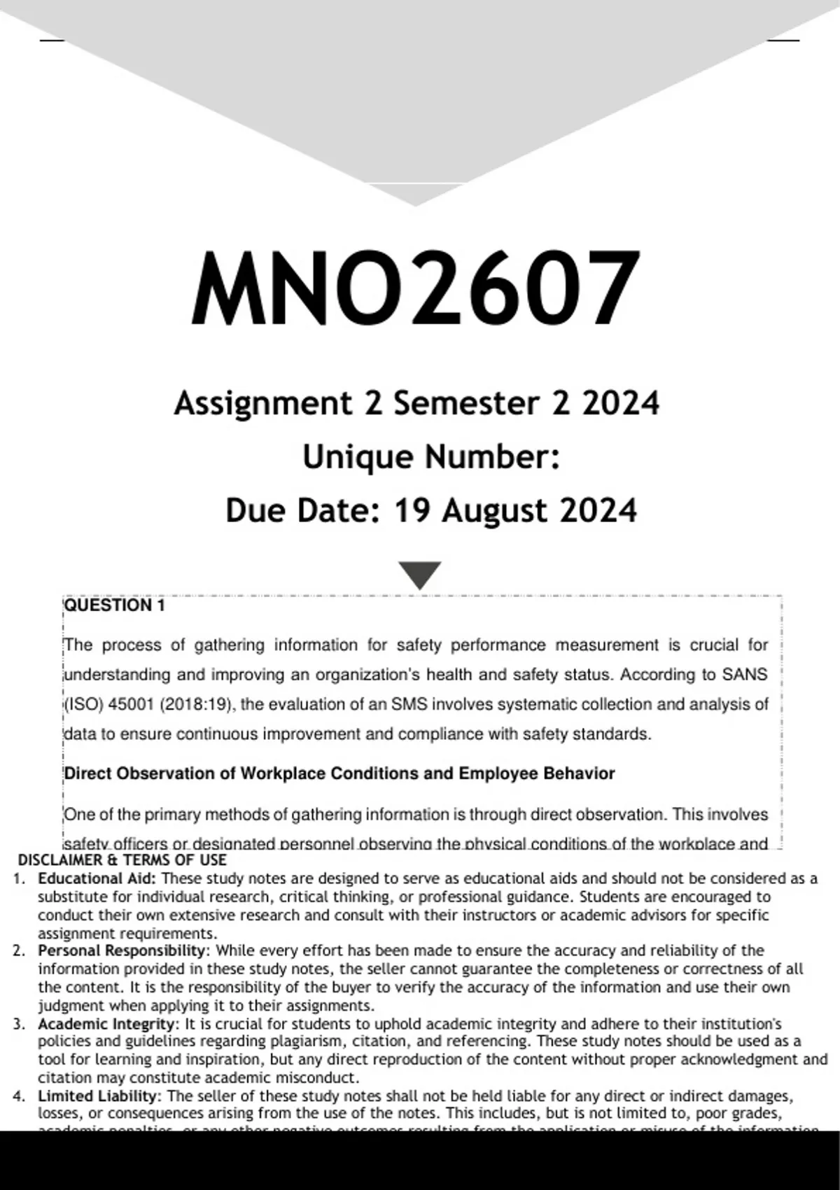 Well-structured MNO2607 Assignment 2 (ANSWERS) Semester 2 2024 - DISTINCTION GUARANTEED. (DETAILED ANSWERS - DISTINCTION GUARANTEED!)..... 1. Explain the process of gathering information for safety performance measurement. (10) 2. Illustrate and describe the PDCA cycle and risk management elements to monitoring and measuring a safety management system. (10) 3. Interpret the aim of safety audit and categories principles of safety audit compliance. (10)