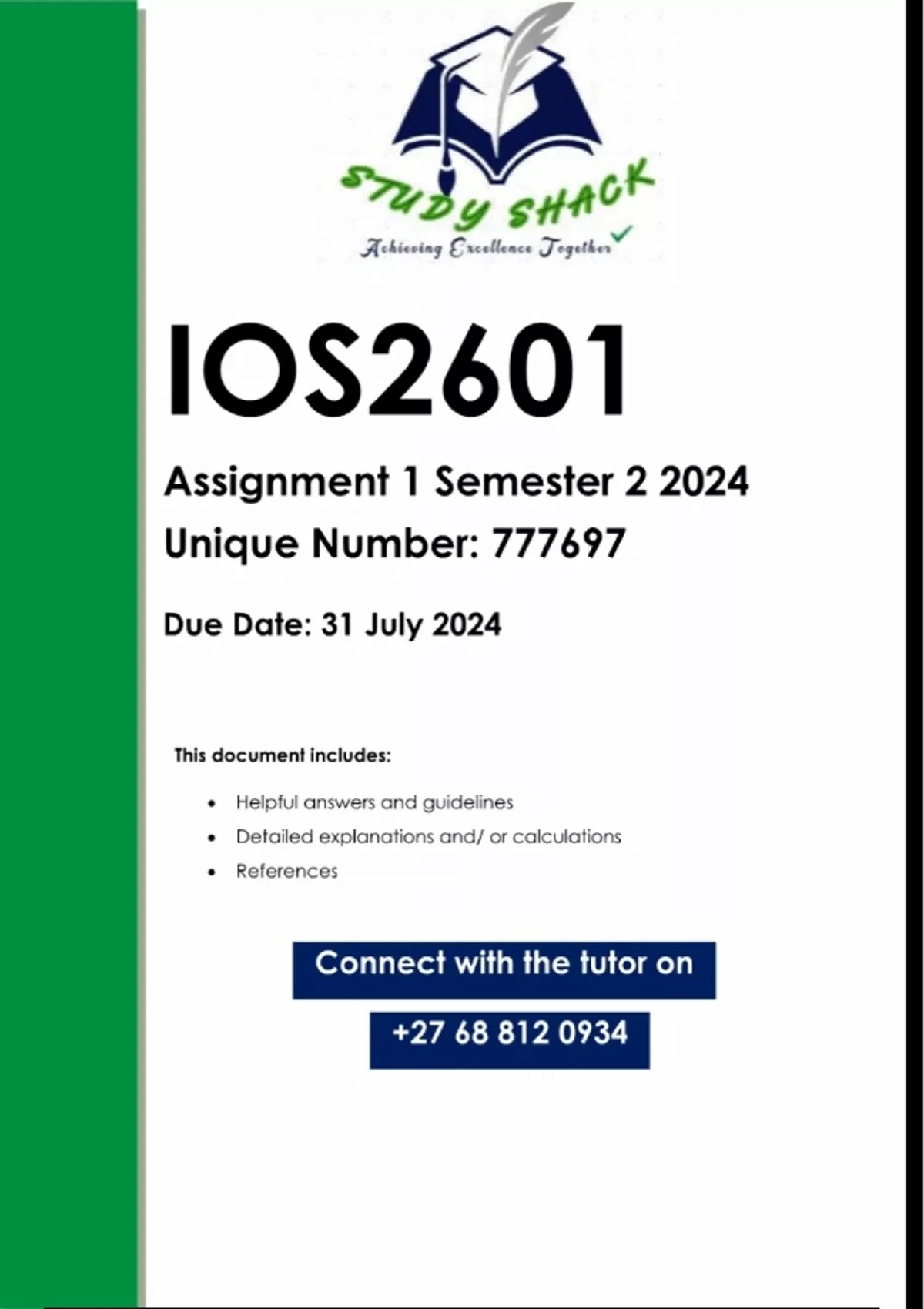 This document contains workings, explanations and solutions to the IOS2601 Assignment 1 (QUALITY ANSWERS) Semester 2 2024. For assistance whats-app us on 0.6.8..8.1.2..0.9.3.4.. 1.With specific reference to section 13(1) of the Interpretation Act 33 of 1957,what do you understand by the terms “adoption”, and “commencement” oflegislation? (5) 2.List and briefly discuss the requirements which were laid down in NationalCoalition for Gay and Lesbian Equality v Minister of Home Affairs 2000 (2) SA1 (CC), before reading-in or severance could take place. Ms (10) 3.Explain the terms “reading-down”, “reading-in” and “severance”. (10) 4.With reference to the case of Commercial Union Assurance Co v Clark 1972(3)SA 508 (A) and Weenen Transitional Council v Van Dyk 2002 (4) SA 653(SCA) explain and distinguish between the directory and peremptoryprovisions. (15) 5.What effect has section 39(2) of the Constitution had on statutory interpretationin South Africa.