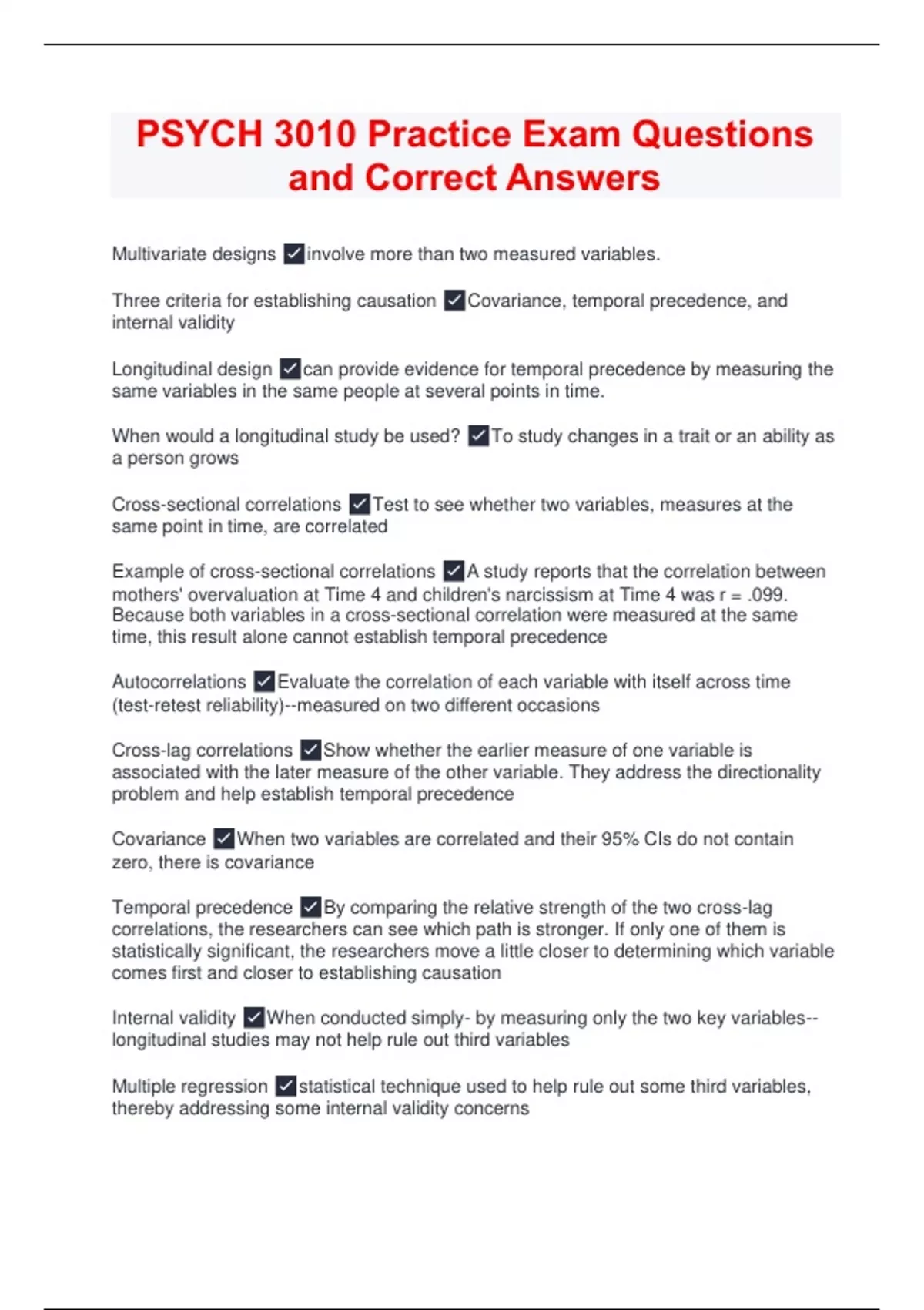 Multivariate designs involve more than two measured variables. Three criteria for establishing causation Covariance, temporal precedence, and internal validity Longitudinal design can provide evidence for temporal precedence by measuring the same variables in the same people at several points in time. When would a longitudinal study be used? To study changes in a trait or an ability as a person grows Cross-sectional correlations Test to see whether two variables, measures at the same point in time, are correlated Example of cross-sectional correlations A study reports that the correlation between mothers' overvaluation at Time 4 and children's narcissism at Time 4 was r = .099. Because both variables in a cross-sectional correlation were measured at the same time, this result alone cannot establish temporal precedence Autocorrelations Evaluate the correlation of each variable with itself across time (test-retest reliability)--measured on two different occasions Cross-lag correlations Show whether the earlier measure of one variable is associated with the later measure of the other variable. They address the directionality problem and help establish temporal precedence Covariance When two variables are correlated and their 95% CIs do not contain zero, there is covariance Temporal precedence By comparing the relative strength of the two cross-lag correlations, the researchers can see which path is stronger. If only one of them is statistically significant, the researchers move a little closer to determining which variable comes first and closer to establishing causation Internal validity When conducted simply- by measuring only the two key variables-- longitudinal studies may not help rule out third variables Multiple regression statistical technique used to help rule out some third variables, thereby addressing some internal validity concern