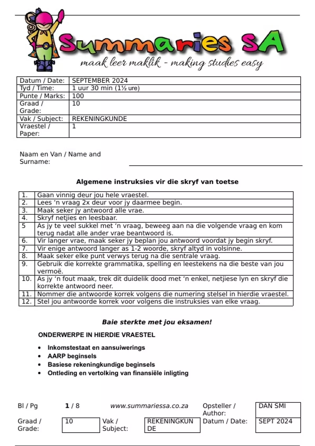 Graad / 10 Vak / REKENINGKUN Datum / Date: SEPT 2024