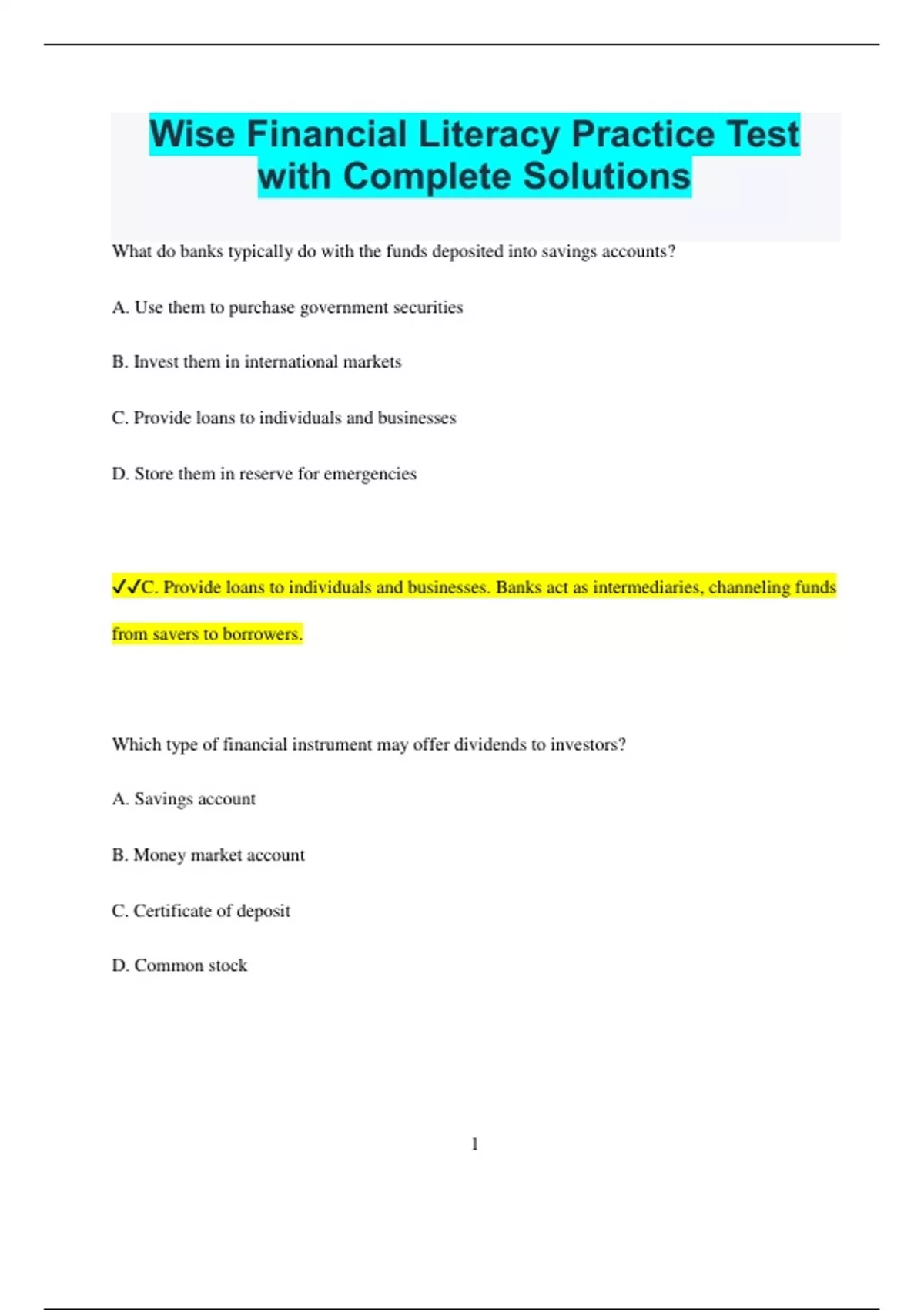 Wise Financial Literacy Practice Test with Complete Solutions What do banks typically do with the funds deposited into savings accounts? A. Use them to purchase government securities B. Invest them in international markets C. Provide loans to individuals and businesses D. Store them in reserve for emergencies C. Provide loans to individuals and businesses. Banks act as intermediaries, channeling funds from savers to borrowers. Which type of financial instrument may offer dividends to investors? A. Savings account B. Money market account C. Certificate of deposit D. Common stock 2 D. Common stock. Dividends are typically associated with common stock, whereas other financial products usually provide interest. Margaret wants to securely store her valuable coin collection and important documents. What is the recommended action? A. Keep them in a personal safe at home B. Rent a safe deposit box at a bank C. Use a safety deposit vault service D. Store them in a home security system B. Rent a safe deposit box at a bank. Renting a safe deposit box at a bank is a common practice for safeguarding valuable items. What should someone do if they need to make a tuition payment annually in August? A. Calculate the total needed and save 1/12th of that amount each month in a separate account B. Save the full amount in a single lump sum just before the payment is due C. Set up an automatic payment plan through the bank D. Apply for a short-term loan to cover the cost 3 A. Calculate the total needed and save 1/12th of that amount each month in a separate account. This approach ensures consistent savings throughout the year. What is a Certificate of Deposit (CD)? A. A short-term loan with a fixed interest rate B. A savings vehicle requiring a deposit for a set term, with penalties for early withdrawal C. An investment account with variable interest rates D. A checking account with high interest B. A savings vehicle requiring a deposit for a set term, with penalties for early withdrawal. A CD involves locking funds for a