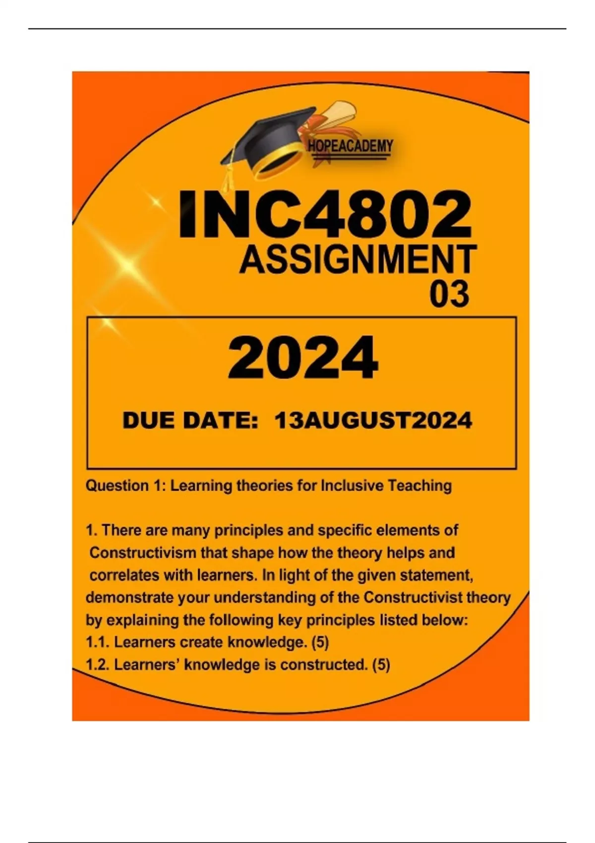 INC4802 ASSIGN MENT 3 DUE 13 AUGUST 2023 Question 1: Learning theories for Inclusive Teaching 1. There are many principles and specific elements of Constructivism that shape how the theory helps and correlates with learners. In light of the given statement, demonstrate your understanding of the Constructivist theory by explaining the following key principles listed below: 1.1. Learners create knowledge. (5)