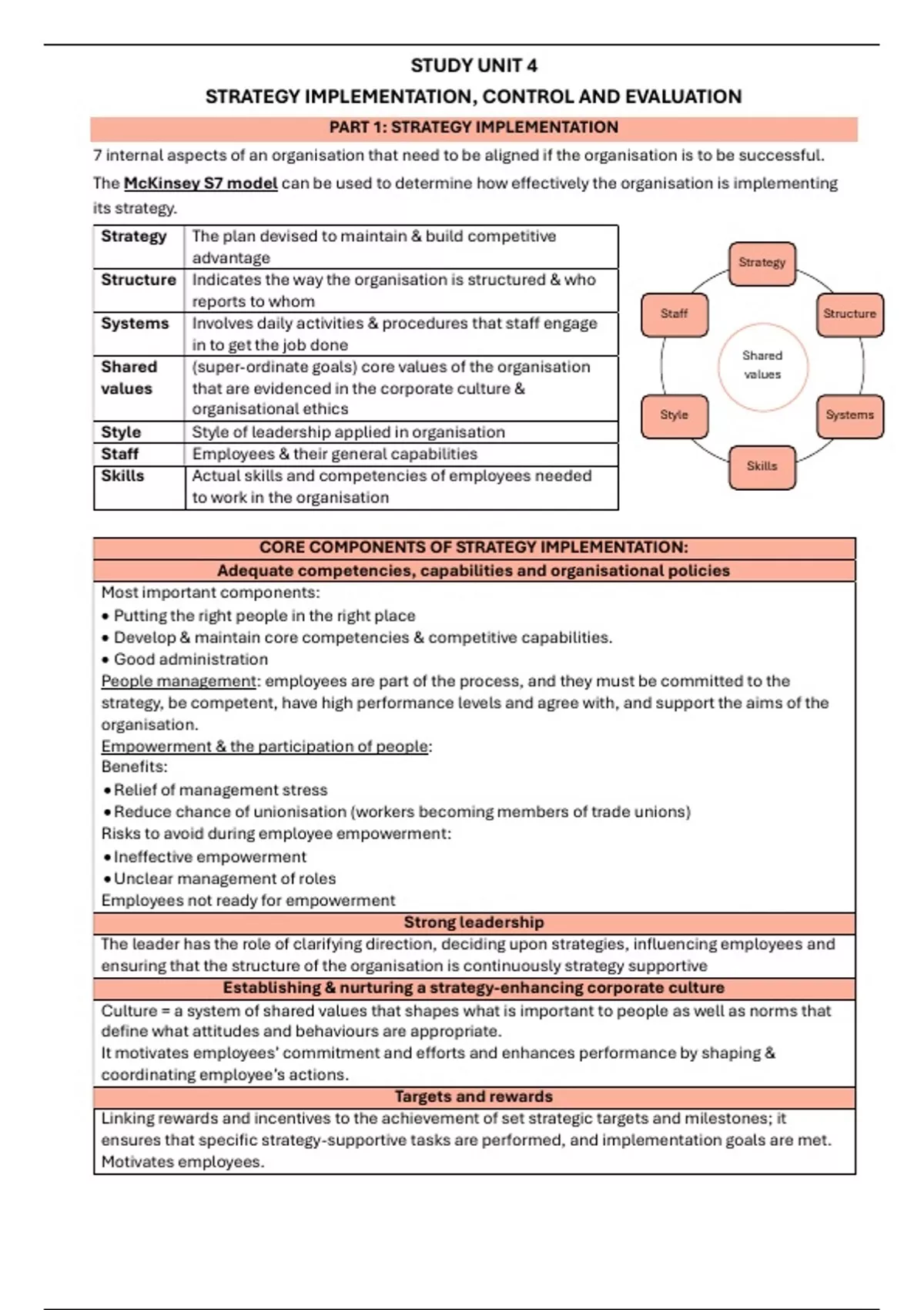 A detailed summary of strategy implementation, the core components thereof, the role of leadership in the process, the characteristics of a strategic leader, the key actions and responsibilities of a leader, leadership styles. Strategic change: definition, types, issues, causes and managing resistance to change. Strategic evaluation and general points to consider, decisional techniques and the balanced scorecard.