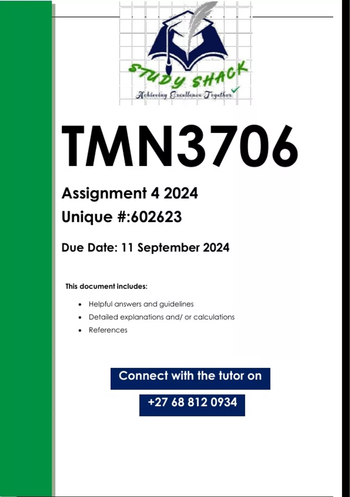 This document contains workings, explanations and solutions to the TMN3706 Assignment 4 (QUALITY ANSWERS) 2024. For assistance whats-app us on 0.6.8..8.1.2..0.9.3.4... QUESTION 1 Discuss a Social Sciences lesson in terms of its aims, the introduction, lesson development, consolidation, and conclusion. (50) 100 TMN3706/Assignment 04 /2024 We will know that students are competent to identify and use media and technology appropriate for use in a particular context QUESTION 2 Discuss how to integrate the use of ICT in your Social Science classroom. (50)