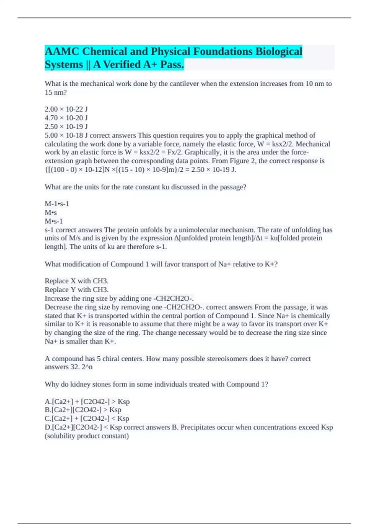What is the mechanical work done by the cantilever when the extension increases from 10 nm to 15 nm? 2.00 × 10-22 J 4.70 × 10-20 J 2.50 × 10-19 J 5.00 × 10-18 J correct answers This question requires you to apply the graphical method of calculating the work done by a variable force, namely the elastic force, W = ksx2/2. Mechanical work by an elastic force is W = ksx2/2 = Fx/2. Graphically, it is the area under the force-extension graph between the corresponding data points. From Figure 2, the correct response is {[(100 - 0) × 10-12]N ×[(15 - 10) × 10-9]m}/2 = 2.50 × 10-19 J. What are the units for the rate constant ku discussed in the passage? M-1•s-1 M•s M•s-1 s-1 correct answers The protein unfolds by a unimolecular mechanism. The rate of unfolding has units of M/s and is given by the expression Δ[unfolded protein length]/Δt = ku[folded protein length]. The units of ku are therefore s-1. What modification of Compound 1 will favor transport of Na+ relative to K+? Replace X with CH3. Replace Y with CH3. Increase the ring size by adding one -CH2CH2O-. Decrease the ring size by removing one -CH2CH2O-. correct answers From the passage, it was stated that K+ is transported within the central portion of Compound 1. Since Na+ is chemically similar to K+ it is reasonable to assume that there might be a way to favor its transport over K+ by changing the size of the ring. The change necessary would be to decrease the ring size since Na+ is smaller than K+. A compound has 5 chiral centers. How many possible stereoisomers does it have? correct answers 32. 2^n Why do kidney stones form in some individuals treated with Compound 1? A.[Ca2+] + [C2O42-] > Ksp B.[Ca2+][C2O42-] > Ksp C.[Ca2+] + [C2O42-] < Ksp D.[Ca2+][C2O42-] < Ksp correct answers B. Precipitates occur when concentrations exceed Ksp (solubility product constant)