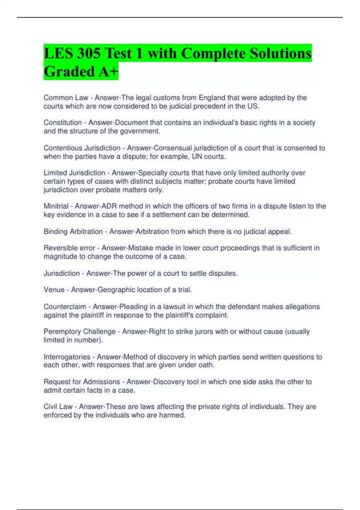 LES 305 Test 1 with Complete Solutions Graded A+ Common Law - Answer-The legal customs from England that were adopted by the courts which are now considered to be judicial precedent in the US. Constitution - Answer-Document that contains an individual's basic rights in a society and the structure of the government. Contentious Jurisdiction - Answer-Consensual jurisdiction of a court that is consented to when the parties have a dispute; for example, UN courts. Limited Jurisdiction - Answer-Specialty courts that have only limited authority over certain types of cases with distinct subjects matter; probate courts have limited jurisdiction over probate matters only. Minitrial - Answer-ADR method in which the officers of two firms in a dispute listen to the key evidence in a case to see if a settlement can be determined. Binding Arbitration - Answer-Arbitration from which there is no judicial appeal. Reversible error - Answer-Mistake made in lower court proceedings that is sufficient in magnitude to change the outcome of a case. Jurisdiction - Answer-The power of a court to settle disputes. Venue - Answer-Geographic location of a trial. Counterclaim - Answer-Pleading in a lawsuit in which the defendant makes allegations against the plaintiff in response to the plaintiff's complaint. Peremptory Challenge - Answer-Right to strike jurors with or without cause (usually limited in number). Interrogatories - Answer-Method of discovery in which parties send written questions to each other, with responses that are given under oath. Request for Admissions - Answer-Discovery tool in which one side asks the other to admit certain facts in a case.