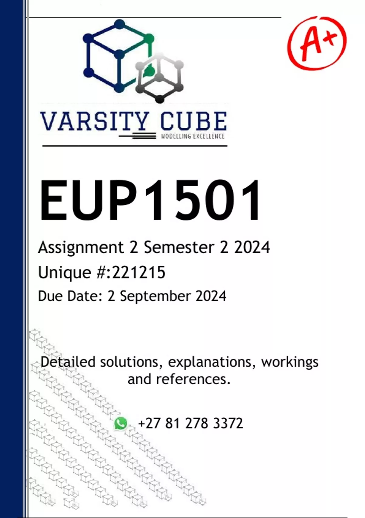 EUP1501 Assignment 2 (DETAILED ANSWERS) Semester 2 2024 - DISTINCTION GUARANTEED - DISTINCTION GUARANTEED - DISTINCTION GUARANTEED Answers, guidelines, workings and references .... 1 Open the Word document EUP1501-MS Word Assessment downloaded with this document. 0 2 Above existing text, Type Exciting Internship Opportunity for Aspiring Social Media Influencers!, and press enter. 5 3 Select the title, and from the Text Effects and Typography gallery, in the second row, apply the fourth effect. Change the font size to 44. 6 4 With the title still selected, display the Font Color palette, and then in the last column, apply the second color. Center the title. 5 5 Position the insertion point at the end of the first paragraph and press enter Twice. Then copy and paste the picture below: 4 6 Change the Height of the picture to 3.49 and then change the Layout Options to Square. 10 7 Using the Position command, display the Layout dialog box and then change the Horizontal Alignment to Right relative to the Margin. 5 8 Apply a 10 Point Soft Edges picture effect to the image and then display the Artistic Effects gallery. Apply the Crisscross Etching effect. 5 9 Deselect the picture. Apply a 3 pt Page Border to the document using the Shadow setting. Select the first style and then display the color palette. In the fourth column, select the first color. 6 10 After Requirements: press enter and draw a Text Box. Change the Height of the text box to 4.5 and the Width to 10. 8 11 In the text box, type the following text: Strong understanding of various social media platforms (Instagram, TikTok, YouTube, etc.) Creativity and a knack for storytelling through captivating content Excellent communication skills, both written and verbal Ability to collaborate effectively with team members and influencers 6 12 In the text box, change font size of all the text to 11. Apply Bold and Bullets 4 13 Apply a Shape Style to the text box—under Theme Styles, select Colored Outline – Blue Accent 5 4 14 Insert Your Student_Number in the footer. 4 15 Create a numbered list (I.,II.,III..) using the text below: What You'll Gain: 4 16 Change the line spacing for the first paragraph and last paragraph to 1.5 4 17 Save your file as “”EUP1501 - MS Word Assessment 2-YourStudentNumber” and close the file, and then upload for submission. 0
