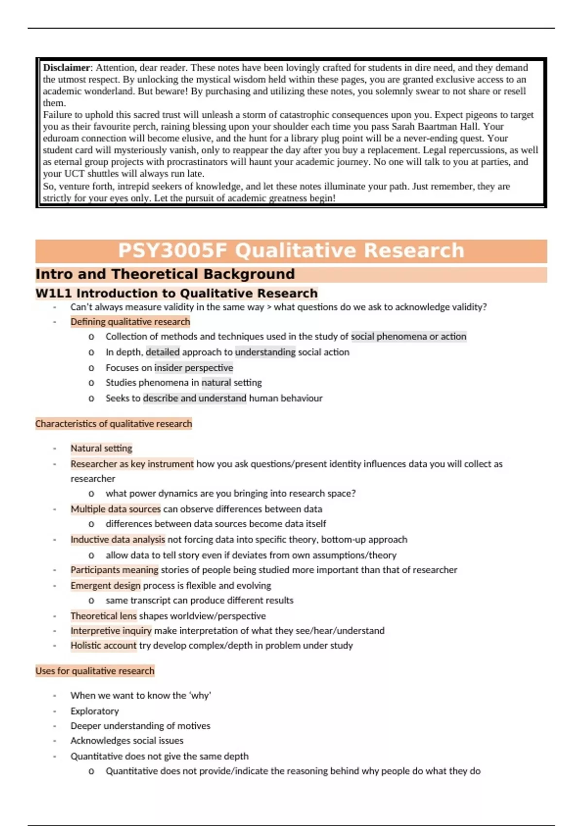 This study document covers all the content needed for the PSY3007S Qualitative Research section. It has content from lecture slides, explanations from lecturers, summaries of readings, as well as helpful comparison tables and summaries of content to aid studying. The document is well organised to help make everything clear and easy to understand. I have been selling notes for my entire time at UCT, and have a lot of experience in making sure that my notes are easy to understand and have everything that you need to do well in this course!