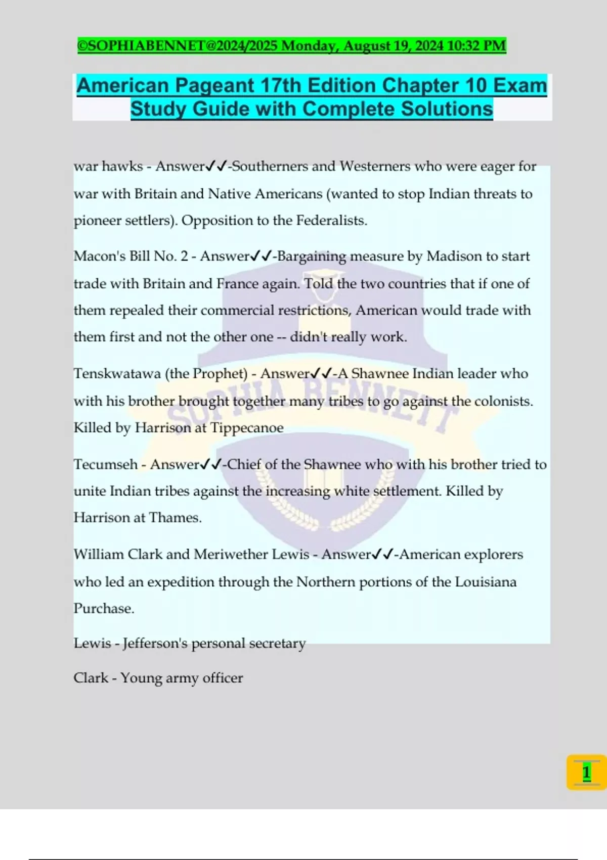American Pageant 17th Edition Chapter 10 Exam Study Guide with Complete Solutions war hawks - Answer️️ -Southerners and Westerners who were eager for war with Britain and Native Americans (wanted to stop Indian threats to pioneer settlers). Opposition to the Federalists. Macon's Bill No. 2 - Answer️️ -Bargaining measure by Madison to start trade with Britain and France again. Told the two countries that if one of them repealed their commercial restrictions, American would trade with them first and not the other one -- didn't really work. Tenskwatawa (the Prophet) - Answer️️ -A Shawnee Indian leader who with his brother brought together many tribes to go against the colonists. Killed by Harrison at Tippecanoe Tecumseh - Answer️️ -Chief of the Shawnee who with his brother tried to unite Indian tribes against the increasing white settlement. Killed by Harrison at Thames. William Clark and Meriwether Lewis - Answer️️ -American explorers who led an expedition through the Northern portions of the Louisiana Purchase. Lewis - Jefferson's personal secretary Clark - Young army officer ©SOPHIABENNET@2024/2025 Monday, August 19, 2024 10:32 PM 2 Napolean Bonaparte - Answer️️ -Ruler of France, sold Louisiana to the Americans after receiving it from the Spanish John Marshall - Answer️️ -Chief Justice of the Supreme Court, Federalist. Presided over cases such as Marbury V. Madison Appointed by John Adams as one of the midnight judges Federalist Thomas Jefferson - Answer️️ -3rd President; leader of Democratic- Republicans; created republicanism; 1st President to take office in Washington D.C. Lowkey problematic. James Madison - Answer️️ -4th President; Secretary of State; lead nation through War of 1812 Toussaint L'Ouverture - Answer️️ -Leader of