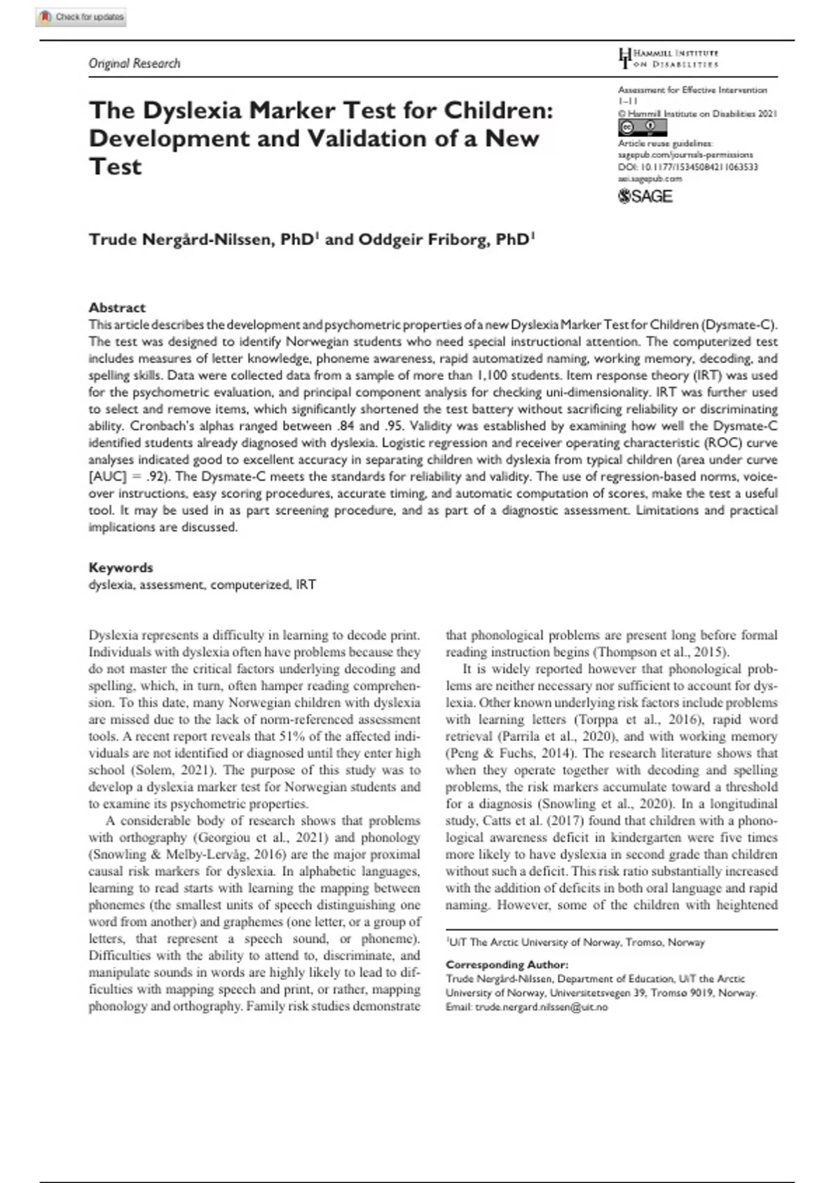 AEIXXX10.1177/15345084211063533Assessment for Effective InterventionNergård Nilssen and Friborg