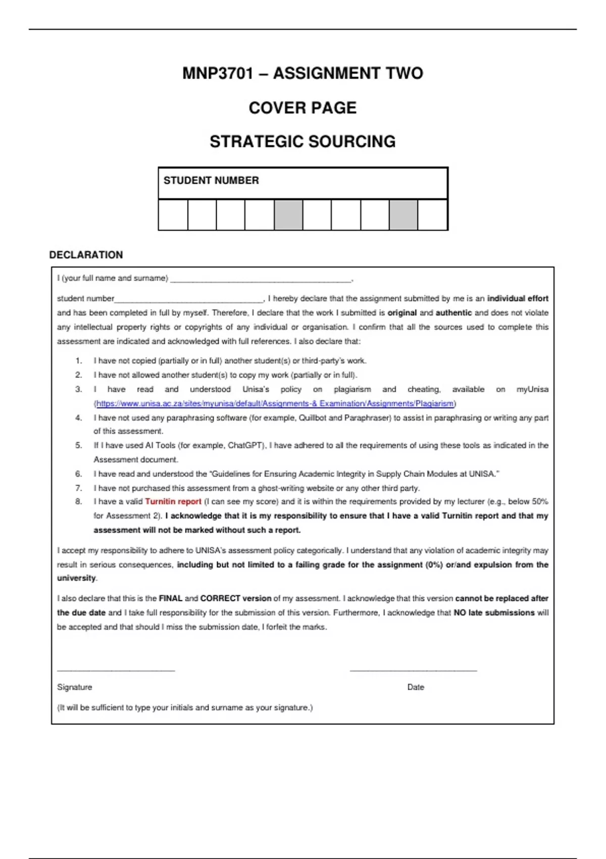I accept my responsibility to adhere to UNISA’s assessment policy categorically. I understand that any violation of academic integrity may