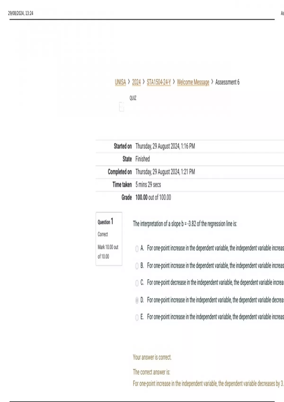 Mark 10.00 out A. For one-point increase in the dependent variable, the independent variable increas