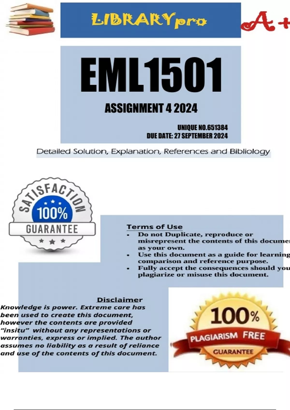 EML1501 Assignment 4 Full Solutions 2024 (651384) - DUE 27 September 2024