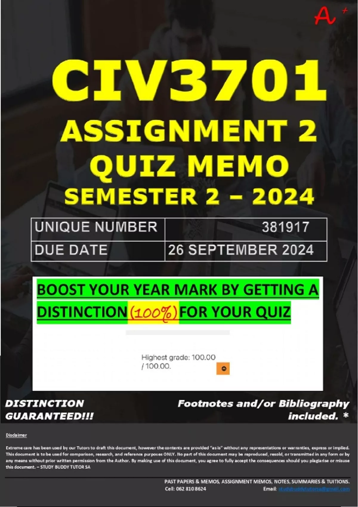 CIV3701 ASSIGNMENT 2 QUIZ MEMO - SEMESTER 2 - 2024 - UNISA - (UNIQUE NUMBER: - 381917 ) (DISTINCTION GUARANTEED) – DUE DATE : 26 SEPTEMBER 2024. BOOST YOUR YEAR MARK BY GETTING 100% FOR YOUR QUIZ!