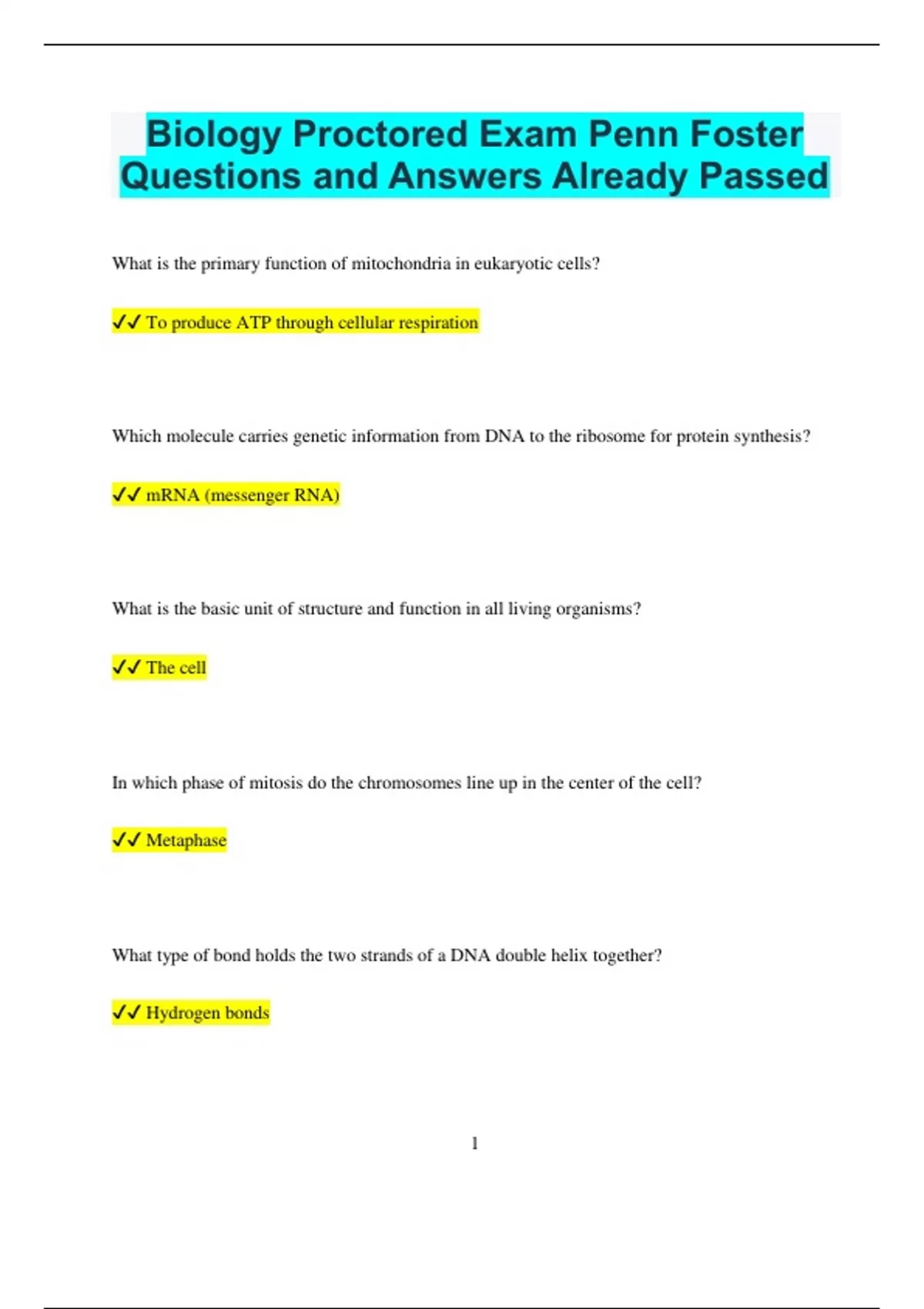 Biology Proctored Exam Penn Foster Questions and Answers Already Passed What is the primary function of mitochondria in eukaryotic cells? To produce ATP through cellular respiration Which molecule carries genetic information from DNA to the ribosome for protein synthesis? mRNA (messenger RNA) What is the basic unit of structure and function in all living organisms? The cell In which phase of mitosis do the chromosomes line up in the center of the cell? Metaphase What type of bond holds the two strands of a DNA double helix together? Hydrogen bonds 2 Which organelle is known as the "powerhouse" of the cell? Mitochondrion What is the process by which plants convert light energy into chemical energy? Photosynthesis What is the term for the movement of molecules from an area of higher concentration to an area of lower concentration? Diffusion Which macromolecule serves as the primary source of energy for cellular processes? Carbohydrates What is the role of ribosomes in a cell? To synthesize proteins Which type of cell division results in four genetically different gametes? Meiosis