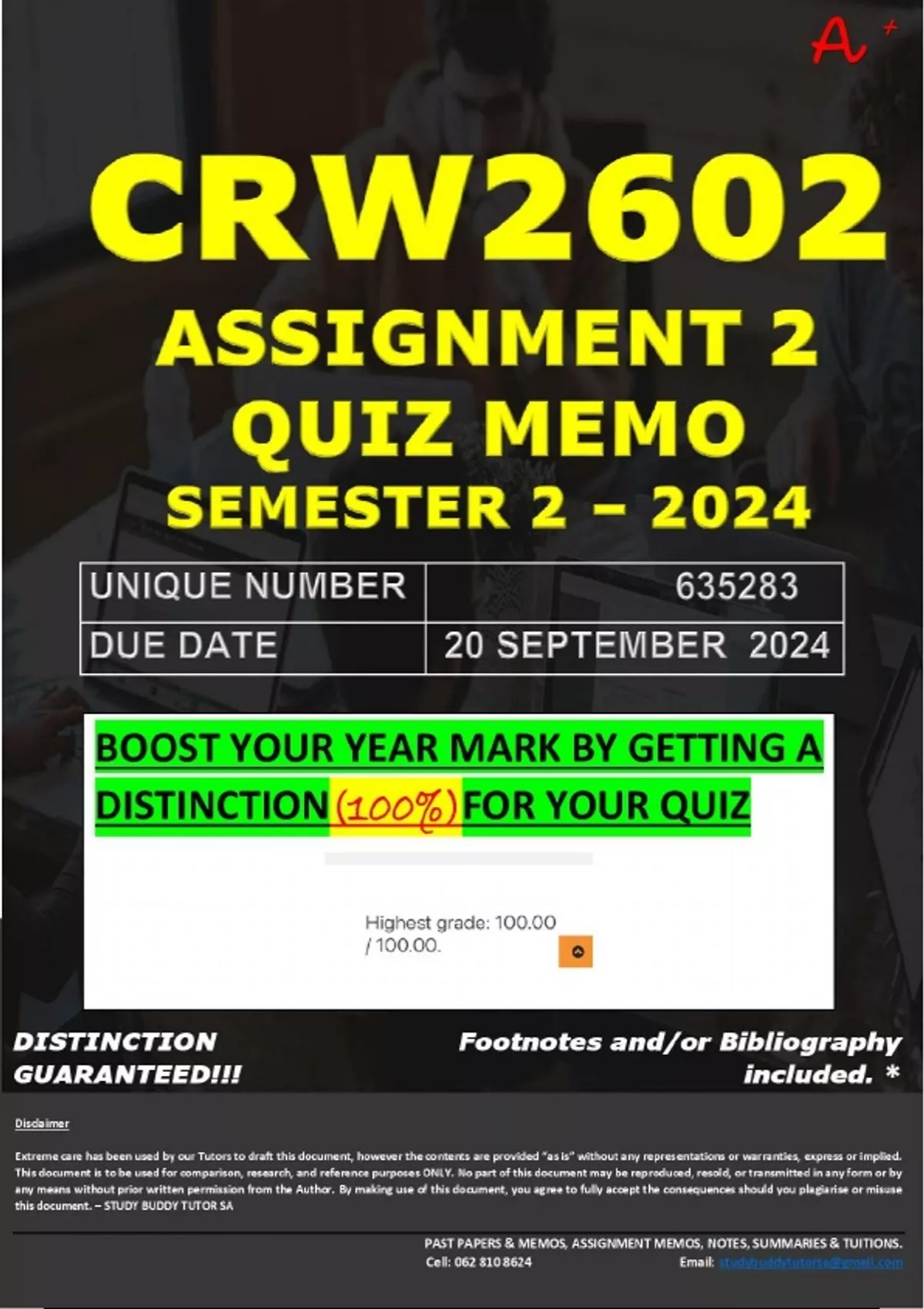 CRW2602 ASSIGNMENT 2 QUIZ MEMO - SEMESTER 2 - 2024 - UNISA - (UNIQUE NUMBER: - 635283 (DISTINCTION GUARANTEED) – DUE DATE : 20 SEPTEMBER 2024. BOOST YOUR YEAR MARK BY GETTING 100% FOR YOUR QUIZ!