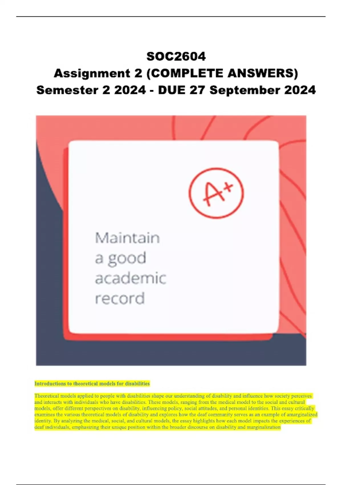 SOC2604 Assignment 2 (COMPLETE ANSWERS) Semester 2 2024 - DUE 27 September 2024 ; 100% TRUSTED Complete, trusted solutions and explanations...Write a critical essay on the different theoretical models applied to people with disabilities and relate how the deaf community can be regarded as an example of a marginalized identity.