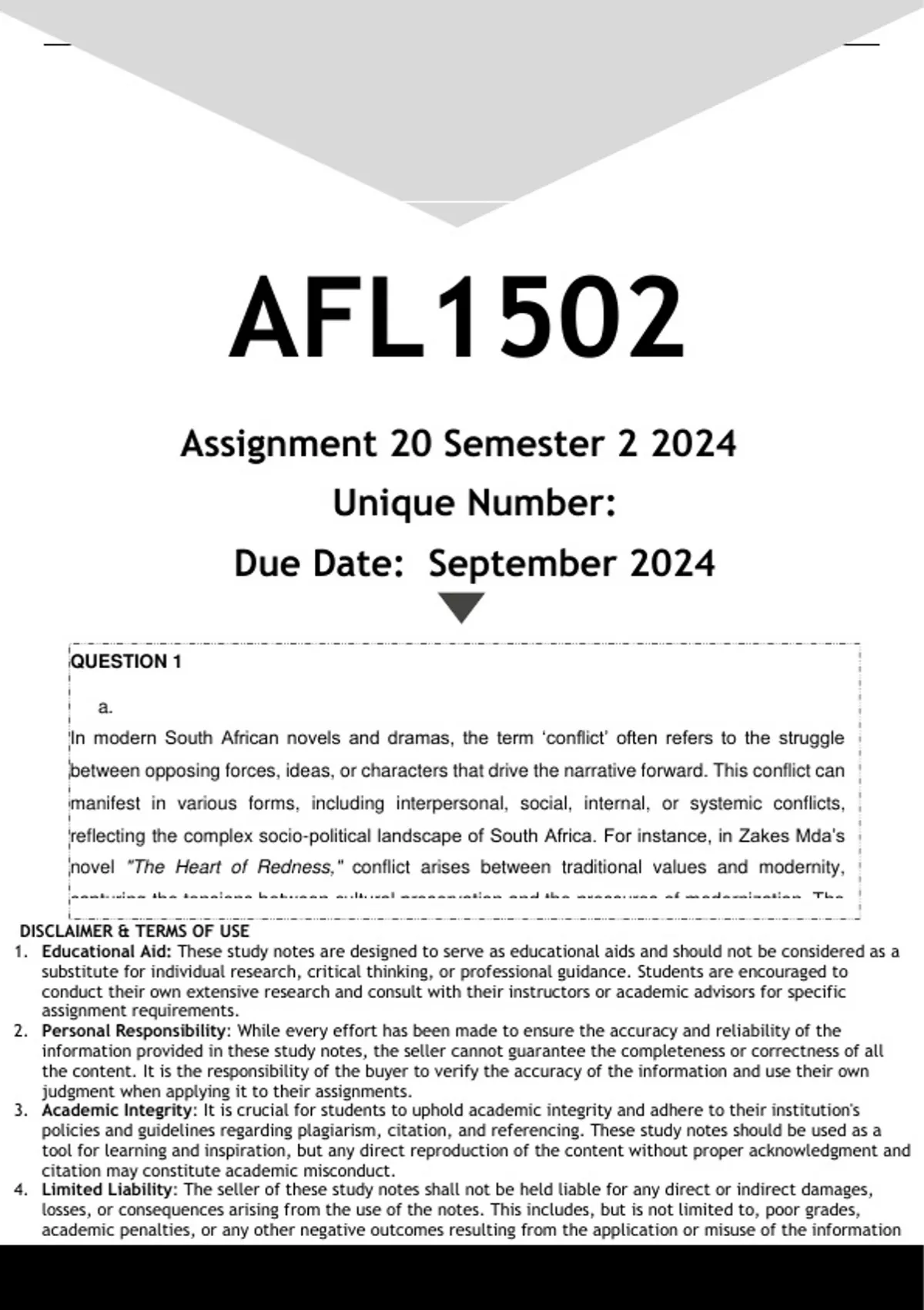 Well-structured AFL1502 Assignment 20 (ANSWERS) Semester 2 2024 - DISTINCTION GUARANTEED. (DETAILED ANSWERS - DISTINCTION GUARANTEED!)..... QUESTION 1 (a) Give a brief explanation of the term ‘conflict’ as found in a modern novel or drama. (10) (b) The structure of an essay may be divided into 3 parts. Identify these 3 parts and then give a brief discussion of each part. (9) (c) Read the following poem and answer the questions: THE SECRET OF LIFE The secret of life is nice tasting, It is inside you in the heart, Also in a closed book, When you open it you read it, You will find everything of life. On a page that is starting to be written on, Life is like a lot of diviners. Enjoyment and pain walk together, Just like darkness is the brother of the night; And light is the brother of the afternoon. (i) Identify and rewrite any 2 poetic devices that the poet has used in the poem. (4) (ii) In what way does the poem above differ from a narrative text like a short story? Give only one different. (2) /25/ QUESTION 2 (a) Give a brief definition of Traditional poetry in the African languages. (3) (b) What is the term for praise poems in your chosen African language? Now give 2 functions of praise poems. (5) (c) What is the main aim of chanting clan praises? (2) (d) Various factors can influence the creativity of an oral performer of folklore and can make the narration more vivid, interesting, and convincing. Discuss 3 of these factors. (6) AFL1502/101/2/2024 31 (e) Discuss the relationship between any 3 soccer teams and the slogans or praises they are associated with. (6) (f) Identify an advertisement that appears in your language in the media (in a magazine, alongside the road, etc.) and explain the emotion(s) it elicits in you as speaker of the language.