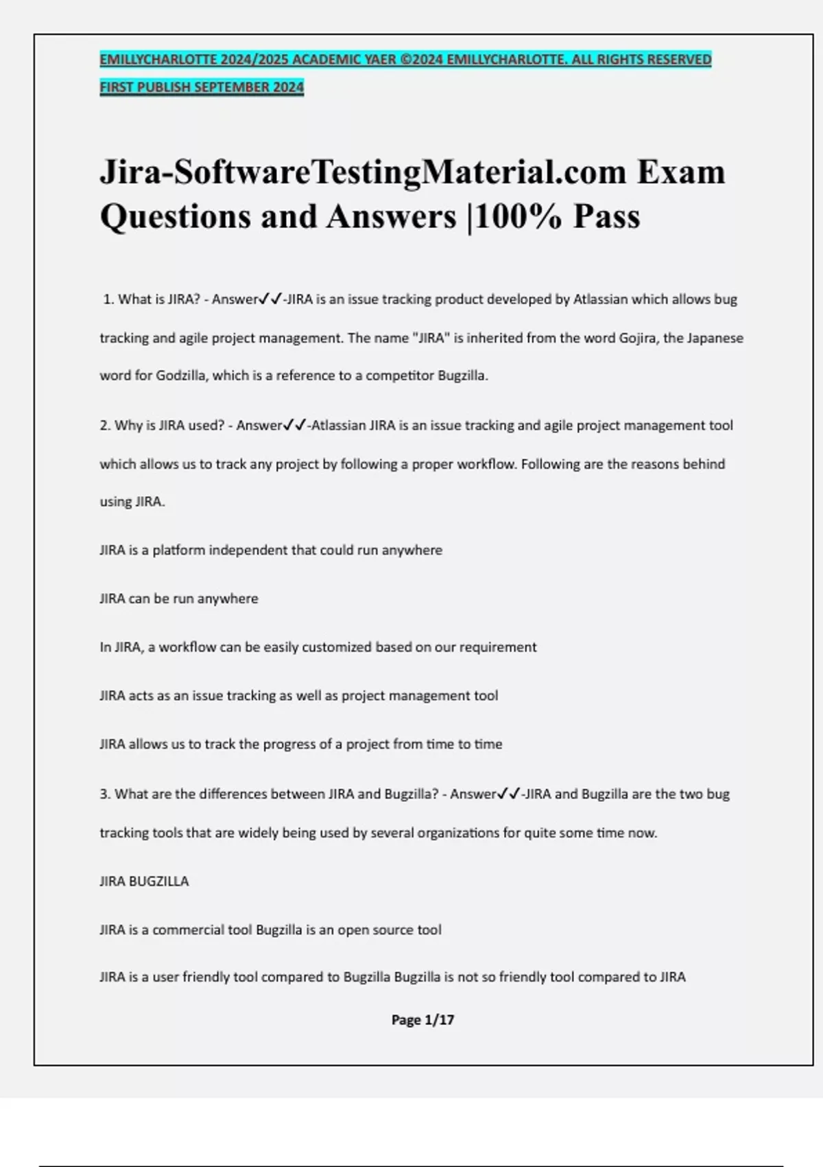 Jira-SoftwareTestingM Exam Questions and Answers |100% Pass 1. What is JIRA? - Answer-JIRA is an issue tracking product developed by Atlassian which allows bug tracking and agile project management. The name "JIRA" is inherited from the word Gojira, the Japanese word for Godzilla, which is a reference to a competitor Bugzilla. 2. Why is JIRA used? - Answer-Atlassian JIRA is an issue tracking and agile project management tool which allows us to track any project by following a proper workflow. Following are the reasons behind using JIRA. JIRA is a platform independent that could run anywhere JIRA can be run anywhere In JIRA, a workflow can be easily customized based on our requirement JIRA acts as an issue tracking as well as project management tool JIRA allows us to track the progress of a project from time to time 3. What are the differences between JIRA and Bugzilla? - Answer-JIRA and Bugzilla are the two bug tracking tools that are widely being used by several organizations for quite some time now. JIRA BUGZILLA JIRA is a commercial tool Bugzilla is an open source tool JIRA is a user friendly tool compared to Bugzilla Bugzilla is not so friendly tool compared to JIRA EMILLYCHARLOTTE 2024/2025 ACADEMIC YAER ©2024 EMILLYCHARLOTTE. ALL RIGHTS RESERVED FIRST PUBLISH SEPTEMBER 2024 Page 2/17 Drag and drop issue prioritization is available in JIRA Drag and drop issue prioritization is not available in Bugzilla JIRA has configurable link types with user-defined semantics. JIRA also has pluggable remote issue links, that allow to link an issue to any other entity outside JIRA Bugzilla has only one link type: blocks/depends, plus a Bug ID custom field Unlike Bugzilla, JIRA allows to define multiple workflows which are applied based on the issue's Project and Type Unlike JIRA, Bugzilla can let users select the initial status of a new issue Custom field types available in JIRA are too many to list, and even more custom field types available from plugins Custom field types available in Bugzilla are Text fields, Multi-selection, Drop-down, Date/time, Bug ID JIRA allows conditional configuration based only on Project and Type fields Bugzilla lets you show/hide the whole custom field or specific values based on the value of some other field JIRA lacks advance-level search options. JIRA has flexible JQL language (JIRA Query Language) that allows you to build arbitrary boolean expressions Bugzilla's comes with a powerful advanced search option 4. Can Jira be used for test case management? - Answer-Although JIRA was not designed to serve as a Test Case Management, it can be configured to support test case management in two different ways. You can either change native components in JIRA to meet test case management needs or you can use one of the add-ons available in Atlassian Marketplace (Example: Zephyr of JIRA) Popular Test Management Tools EMILLYCHARLOTTE 2024/2025 ACADEMIC YAER ©2024 EMILLYCHARLOTTE. ALL RIGHTS RESERVED FIRST PUBLISH SEPTEMBER 2024 Page 3/17 5. What is a workflow in JIRA? - Answer-Workflow is defined as a series of sequential tasks that need to be completed in order to reach a certain goal. A workflow in JIRA is defined as a series of sequential tasks (such as create/open a bug, Work in progress, and completed/closed) involved in the life cycle of a bug or an issue. Create: Create an issue or bug Work in progress: Series of actions performed to fix the issue Closed: Completion of the issue after verification JIRA Workflow 6. Explain working with workflows in JIRA? - Answer-A JIRA workflow is a set of statuses and transitions that an issue travels through during its lifecycle and normally represents processes within your organization. There are pre-defined built-in workflows that can't be edited; however, you can copy and utilize these workflows to create your own. Working with Workflows in JIRA 7. What are the limitations when editing an active workflow? - Answer-Limitations apply when editing the draft for an active workflow: It is not possible to edit the workflow name Workflow statuses cannot be deleted If a status has no outgoing transitions, it cannot have any outgoing transitions added, regular or global The step ID cannot be changed EMILLYCHARLOTTE 2024/2025 ACADEMIC YAER ©2024 EMILLYCHARLOTTE. ALL RIGHTS RESERVED FIRST PUBLISH SEPTEMBER 2024 Page 4/17 8. What is a Workflow designer in JIRA? - Answer-The workflow designer in JIRA is a graphical tool that enables you to see the layout of your workflow and to create and modify a workflow's procedures and transitions. You can manage status and transitions: add, click and drag, or select to edit properties to rename, or delete You can add a global transition that permits different status in the workflow to transition to the selected status. Select Allow all statuses to transition to this one in the properties board for the transition. You can change the screen that a transition uses. You can configure advanced transition options such as conditions, triggers, validators, and post functions. 9. How does a service desk work in JIRA? - Answer-Here is how Customers and Service desk agents work together to resolve a request in JIRA. Your customer submits a request to service agents through a portal or by email Service desk agents see the request in their JIRA Service Desk line and investigate the issue. Your customer and other participants utilize the portal or email to discuss the request with service desk agent, who works in JIRA Service Desk. Your service agent completes the request and your customer is satisfied. 10. How are reports generated in JIRA? - Answer-Steps to follow to generate reports in JIRA are as follows: Step 1: Navigate to the desired board and click Reports. You can find different types of reports. EMILLYCHARLOTTE 2024/2025 ACADEMIC YAER ©2024 EMILLYCHARLOTTE. ALL RIGHTS RESERVED FIRST PUBLISH SEPTEMBER 2024 Page 5/17 Step 2: Click Switch report to view a different report. Step 3: Click on the switch report op
