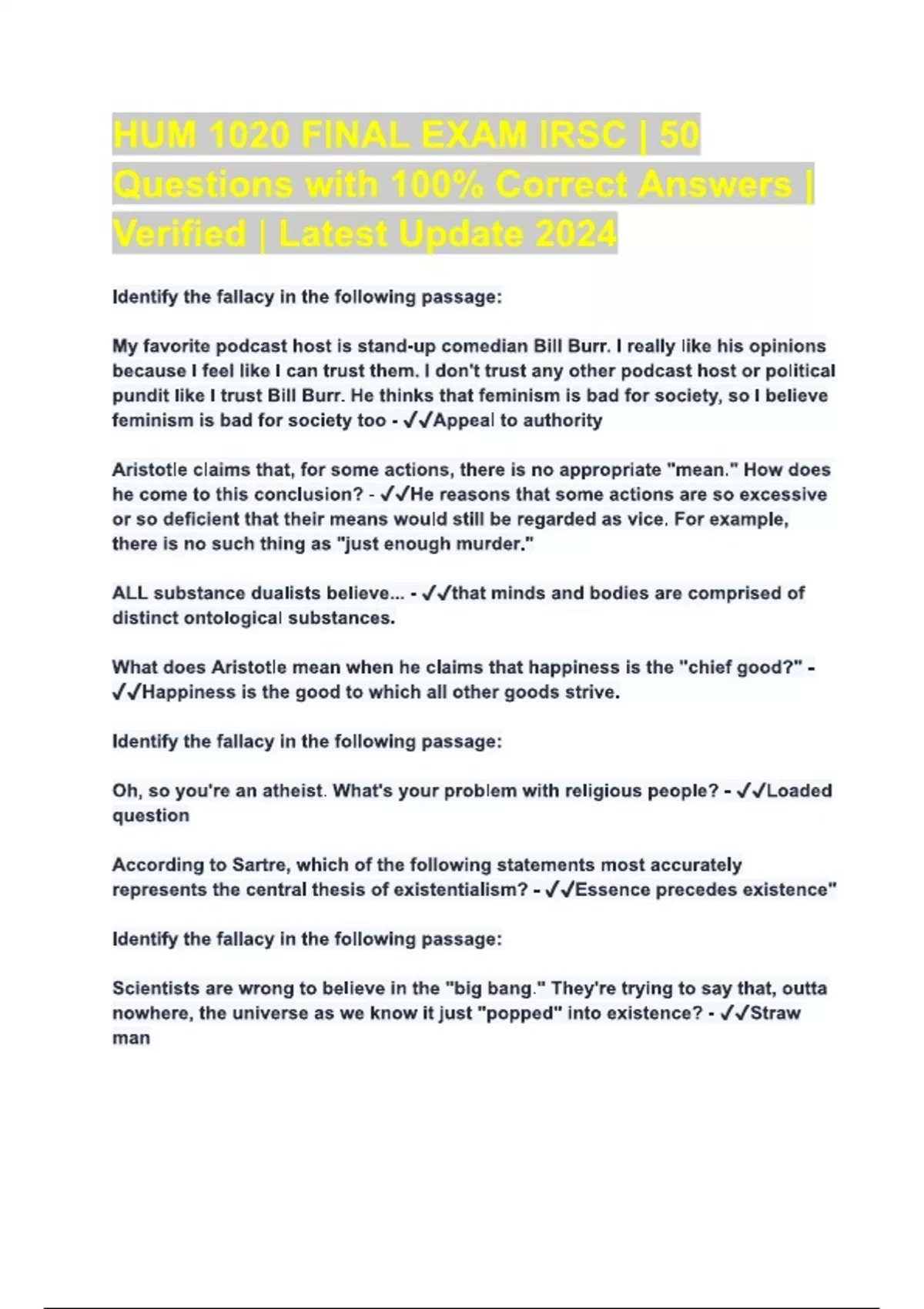 hum1020 final exam irsc with complete solutions