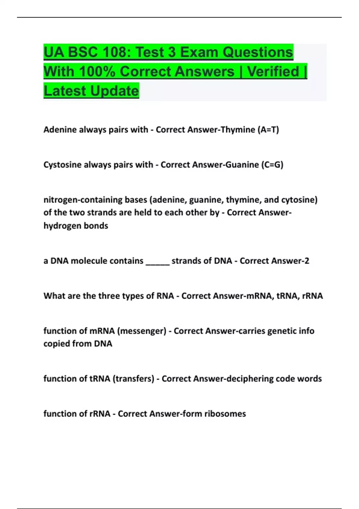 Adenine always pairs with - Correct Answer-Thymine (A=T)