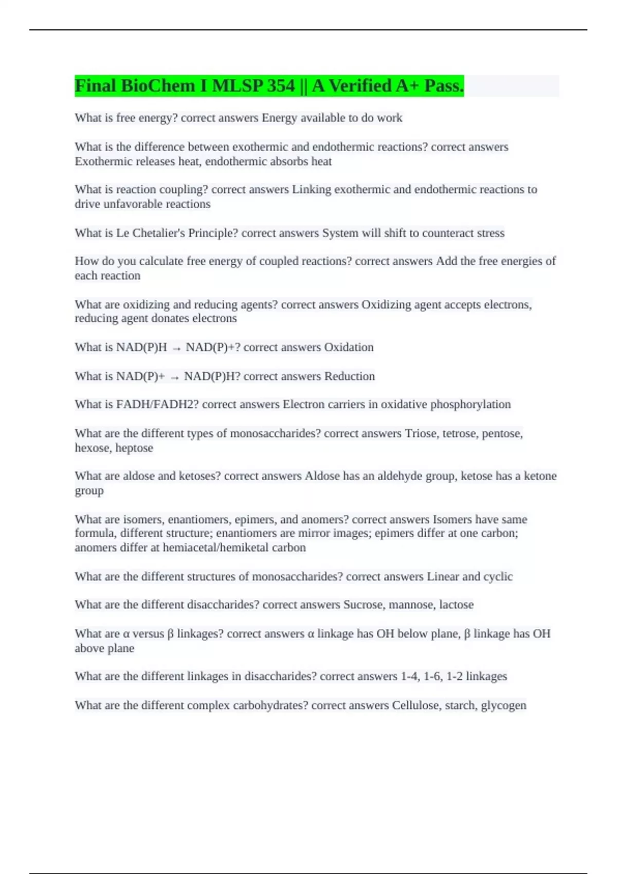 Final BioChem I MLSP 354 || A Verified A+ Pass.