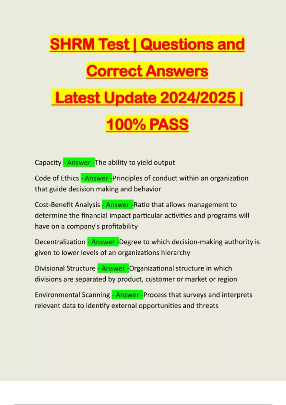 SHRM Test | Questions and Correct Answers Latest Update 2024/2025 | 100% PASS Capacity - Answer -The ability to yield output Code of Ethics - Answer -Principles of conduct within an organization that guide decision making and behavior Cost-Benefit Analysis - Answer -Ratio that allows management to determine the financial impact particular activities and programs will have on a company's profitability Decentralization - Answer -Degree to which decision-making authority is given to lower levels of an organizations hierarchy Divisional Structure - Answer -Organizational structure in which divisions are separated by product, customer or market or region Environmental Scanning - Answer -Process that surveys and interprets relevant data to identify external opportunities and threatsForeign Corrupt Practices Act - Answer -Prohibits American companies from making corrupt payments to foreign officials for the purpose of obtaining or keeping business Functional Structure - Answer -Organizational s