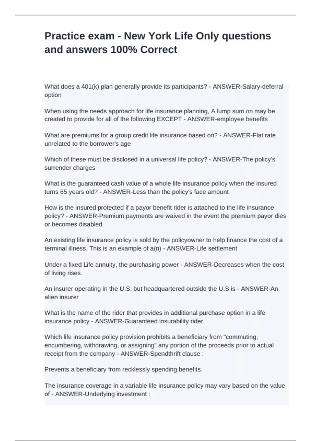 What does a 401(k) plan generally provide its participants? - ANSWER-Salary-deferral option When using the needs approach for life insurance planning, A lump sum on may be created to provide for all of the following EXCEPT - ANSWER-employee benefits What are premiums for a group credit life insurance based on? - ANSWER-Flat rate unrelated to the borrower's age Which of these must be disclosed in a universal life policy? - ANSWER-The policy's surrender charges What is the guaranteed cash value of a whole life insurance policy when the insured turns 65 years old? - ANSWER-Less than the policy's face amount How is the insured protected if a payor benefit rider is attached to the life insurance policy? - ANSWER-Premium payments are waived in the event the premium payor dies or becomes disabled An existing life insurance policy is sold by the policyowner to help finance the cost of a terminal illness. This is an example of a(n) - ANSWER-Life settlement Under a fixed Life annuity, the purchasing power - ANSWER-Decreases when the cost of living rises. An insurer operating in the U.S. but headquartered outside the U.S is - ANSWER-An alien insurer What is the name of the rider that provides in additional purchase option in a life insurance policy - ANSWER-Guaranteed insurability rider Which life insurance policy provision prohibits a beneficiary from "commuting, encumbering, withdrawing, or assigning" any portion of the proceeds prior to actual receipt from the company - ANSWER-Spendthrift clause : Prevents a beneficiary from recklessly spending benefits. The insurance coverage in a variable life insurance policy may vary based on the value of - ANSWER-Underlying investment : Net payment cost index - ANSWER-Useful of one's premium concern is the amount of death benefits provided in the policy. Helpful comparing future costs. Replacing a policy when it is not in the best interest of the client is known as - ANSWER-Twisting What would be considered an advantage of purchasing term life insurance - ANSWER-The initial premium is lower compared to an equivalent amount of whole life coverage Premature IRA distributions are subject to a penalty tax of - ANSWER-10% The exclusion ratio determines - ANSWER-The amount of an annuity payment subject to income tax. When a 10 year renewable term life insurance policy issued at age 45 is renewed, the premium rate will be the current rate for - ANSWER-Ten year term insurance for a person aged 55 Which of these life insurance policies does NOT contain a cash value provision - ANSWER-Decreasing term life: Do not have the ability to gain cash value. The absolute assignment of a life insurance policy results in - ANSWER-all incidents of ownership transferred to the assignee When determining the suitability of an annuity for a consumer, the insurance provider is obligated to - ANSWER-Make reasonable efforts to fit the annuity with the consumer's needs In what way are insurance policies said to be aleatory? - ANSWER-Involves the potential for the unequal exchange of values Accident and health insurance standard provisions require that - ANSWER-Entire contract What could be the potential result of taking out a cash value loan under a life insurance policy? - ANSWER-Reduces the amount receivable upon surrender of the contract Split-dollar - ANSWER-Employer and employee share in the cost of purchasing a life insurance policy on the employee. The employee is also allowed to name the beneficiary.