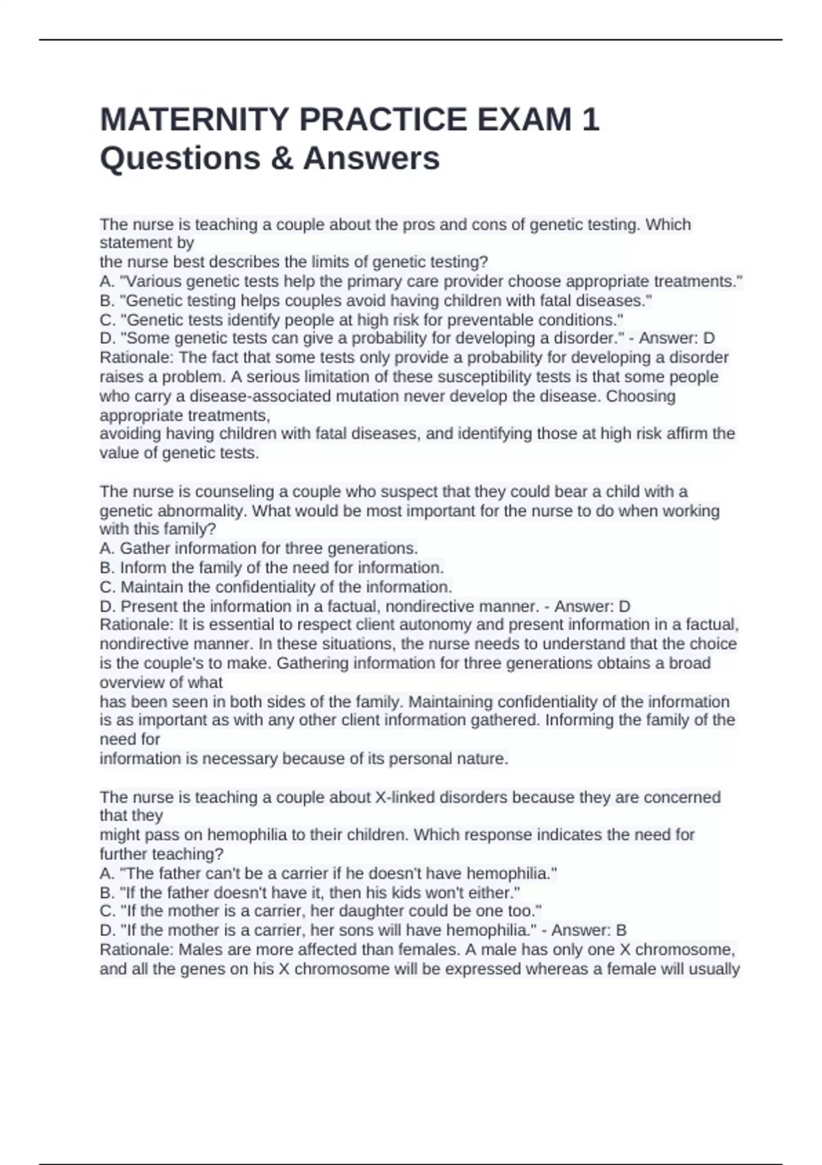 MATERNITY PRACTICE EXAM 1 Questions & Answers