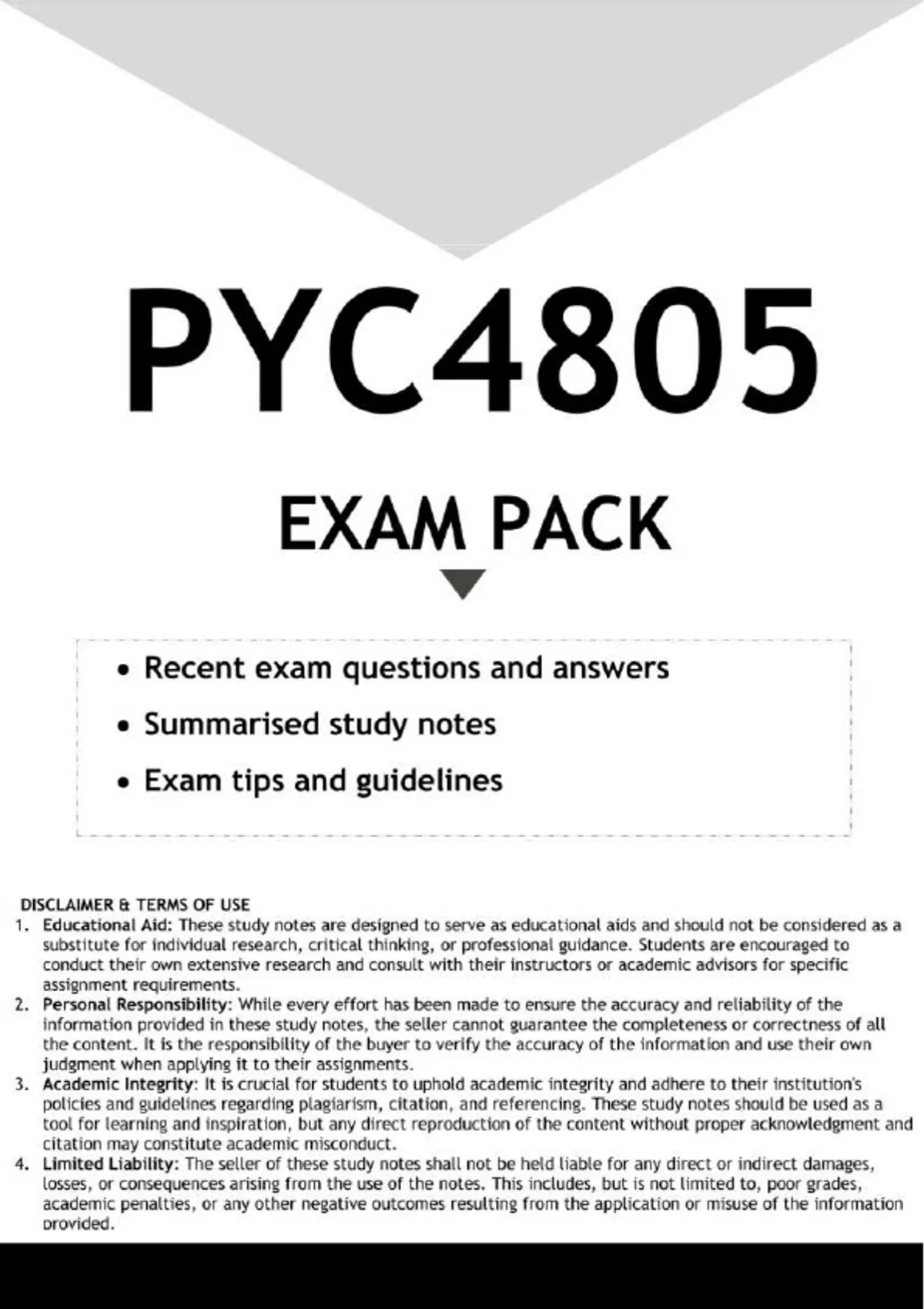 Well-structured PYC4805 EXAM PREPARATION PACK - DISTINCTION GUARANTEED. Contains recent exam questions and answers, and Summarised study notes. All you need to pass the OCTOBER NOVEMBER 2024 EXAMS