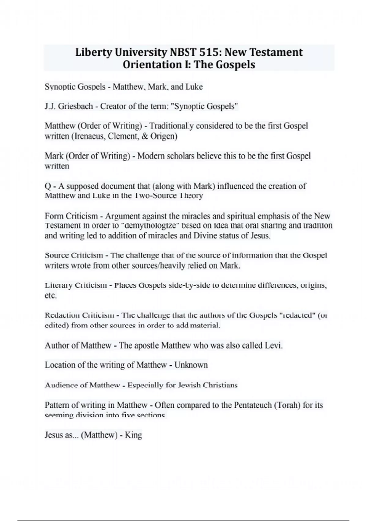 Synoptic Gospels - Matthew, Mark, and Luke J.J. Griesbach - Creator of the term: "Synoptic Gospels" Matthew (Order of Writing) - Traditionally considered to be the first Gospel written (Irenaeus, Clement, & Origen) Mark (Order of Writing) - Modern scholars believe this to be the first Gospel written Q - A supposed document that (along with Mark) influenced the creation of Matthew and Luke in the Two-Source Theory Form Criticism - Argument against the miracles and spiritual emphasis of the New Testament in order to "demythologize" based on idea that oral sharing and tradition and writing led to addition of miracles and Divine status of Jesus. Source Criticism - The challenge that of the source of information that the Gospel writers wrote from other sources/heavily relied on Mark. Literary Criticism - Places Gospels side-by-side to determine differences, origins, etc. Redaction Criticism - The challenge that the authors of the Gospels "redacted" (or edited) from other sources in order to add material. Author of Matthew - The apostle Matthew who was also called Levi. Location of the writing of Matthew - Unknown Audience of Matthew - Especially for Jewish Christians Pattern of writing in Matthew - Often compared to the Pentateuch (Torah) for its seeming division into five sections. Jesus as... (Matthew) - King Matthew's Opening - Genealogy presenting Books that contain the "Olivet Discourse" on the end times - Matthew (25)/Mark (13)/Luke (21) Traditional origins of Matthew - Taught orally before written Key word in Matthew - Kingdom (Used 1/3 of all uses in the New Testament) Dating of the Gospel of Matthew - Approx. AD 60-65 Matthew's closing statement - Great Commission Unique signature that shows Matthew authorship - Emphasis on financial transaction details as Matthew was a tax collector (only Gospel that shares the story of Jesus paying taxes) Language Matthew was written in - Some suggest Matthew was written in Hebrew before being translated to Greek, but most modern scholars refute this idea. Author of Mark - Mark (Undisputed) who wrote primarily from the words of Peter Jesus as... (Mark) - The perfect servant. Location Mark was written - Rome Primary audience of Mark - Roman Christians Date of Mark's writing - Approx. AD 65 Key word in Mark - Immediately (Continual moving actions) Key theme in Mark - Conciseness Mark, separate from Matthew and Luke - Matthew and Luke share the most similarities which has caused many to believe that Mark was written first and Matthew/Luke borrowed from Mark and Q. Key feature of Mark - No genealogy
