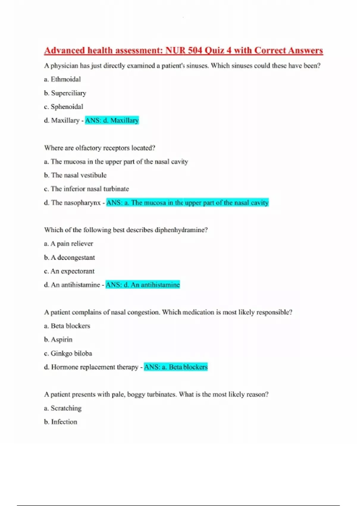 A physician has just directly examined a patient's sinuses. Which sinuses could these have been? a. Ethmoidal b. Superciliary c. Sphenoidal d. Maxillary - ANS: d. Maxillary Where are olfactory receptors located? a. The mucosa in the upper part of the nasal cavity b. The nasal vestibule c. The inferior nasal turbinate d. The nasopharynx - ANS: a. The mucosa in the upper part of the nasal cavity Which of the following best describes diphenhydramine? a. A pain reliever b. A decongestant c. An expectorant d. An antihistamine - ANS: d. An antihistamine A patient complains of nasal congestion. Which medication is most likely responsible? a. Beta blockers b. Aspirin c. Ginkgo biloba d. Hormone replacement therapy - ANS: a. Beta blockers A patient presents with pale, boggy turbinates. What is the most likely reason? a. Scratching b. Infection c. Allergies d. A healthy patient - ANS: c. Allergies A patient presents with congestion, clear rhinorrhea, sinus pain, and patches of eczema. Knowing that there is a risk of anaphylaxis, what test can the physician recommend that will be safe for the patient and help target the specific reason for the symptoms? Which of the following is true about palpation of the cardiovascular system? a. The PMI should be palpated within a 2-centimeter radius. b. Both carotid arteries should be palpated gently and simultaneously to determine a balance of flow. c. Palpating a thrill around the aorta may indicate left ventricular hypertrophy. d. It is important to note pitting edema of the extremities, as this may indicate heart failure. - ANS: d. It is important to note pitting edema of the extremities, as this may indicate heart failure. How is the patient positioned when palpating the precordium and the carotid pulse? a. Supine b. Standing c. Sitting up d. Resting on right side - ANS: a. Supine Who would be a likely candidate for receiving an ultrasound of the abdomen as part of a cardiovascular exam? a. A 66-year-old man with suspected AAA b. A pregnant woman in her second or third trimester c. An 8-year-old girl who complains of not being able to catch her breath d. All 18- to 45-year-old males on well-patient checkups - ANS: a. A 66-year-old man with suspected AAA Which of the following traditional auscultatory areas is in the mitral area (PMI)? a. Second right intercostal b. First right intercostal c. Third left intercostal d. Fifth left intercostal - ANS: d. Fifth left intercostal