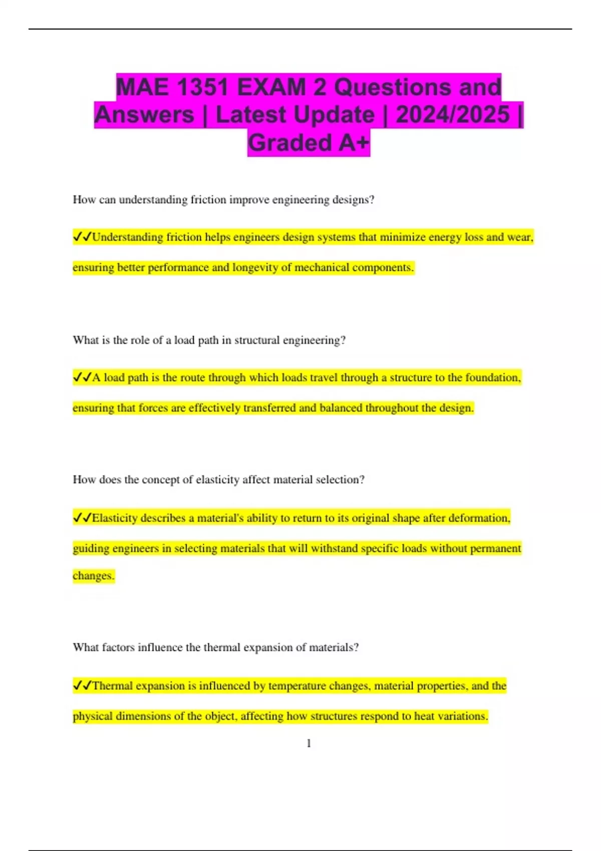 MAE 1351 EXAM 2 Questions and Answers | Latest Update | 2024/2025 | Graded A+ How can understanding friction improve engineering designs? Understanding friction helps engineers design systems that minimize energy loss and wear, ensuring better performance and longevity of mechanical components. What is the role of a load path in structural engineering? A load path is the route through which loads travel through a structure to the foundation, ensuring that forces are effectively transferred and balanced throughout the design. How does the concept of elasticity affect material selection? Elasticity describes a material's ability to return to its original shape after deformation, guiding engineers in selecting materials that will withstand specific loads without permanent changes. What factors influence the thermal expansion of materials? Thermal expansion is influenced by temperature changes, material properties, and the physical dimensions of the object, affecting how structures respond to heat variations. 2 Why is understanding torque important in mechanical systems? Understanding torque is essential for designing mechanisms that involve rotation, as it determines the effectiveness of forces applied at various distances from the pivot point. How do vibrations impact the design of mechanical systems? Vibrations can lead to fatigue and failure in components; therefore, understanding their effects helps engineers design systems that can either dampen or control these vibrations. What is the significance of the stress-strain curve in materials science? The stress-strain curve illustrates a material's response to applied stress, providing critical information on its yield strength, ultimate tensile strength, and ductility. How does buoyancy affect the design of vessels and submarines? Buoyancy plays a crucial role in ensuring that vessels and submarines can float or submerge, guiding designs to balance weight and displacement for stability. What are the implications of thermodynamic cycles in engine design? 3 Thermodynamic cycles describe the processes that engines undergo, influencing efficiency and power output, which are vital for optimizing performance in thermal systems. What role does CAD software play in modern engineering design? Computer-Aided Design (CAD) software allows engineers to create precise drawings and simulations, improving accuracy, efficiency, and collaboration in design processes. How does the concept of redundancy contribute to safety