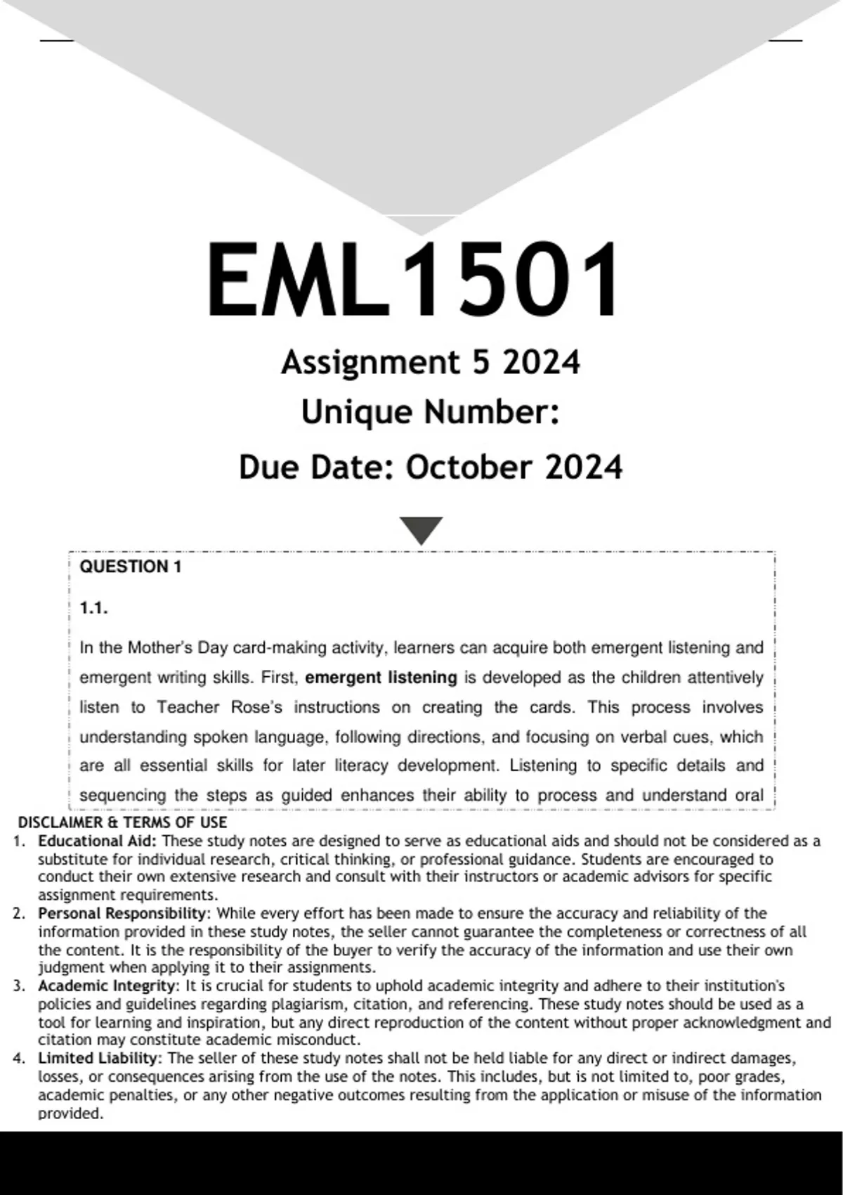 Well-structured EML1501 Assignment 5 (COMPLETE ANSWERS) 2024 - DISTINCTION GUARANTEED. (DETAILED ANSWERS - DISTINCTION GUARANTEED!)..... QUESTION 1 [25] Read the scenario and respond to the questions below. Scenario It is nearing Mother's Day, and teacher Rose has planned for the children to make Mother’s Day cards. Teacher Rose supplies the children with different pieces of paper she has cut out for the main structure of the card, different re-usable waste material, small circles, different shapes and crayons. She gives the children clear instructions about creating Mother’s Day cards. The children remain silent as they carefully listen to her instructions about creating the cards. They are too afraid to make any mistakes. Teacher Rose is pleased to see all the different beautiful cards that the children have created. The children are very happy the activity is over and run off to play outside. 1.1 Identify any two literacy skills that learners can acquire from this activity. (4) 1.2 Compare the role of the teacher to the role of the learners in this lesson. Give reasons to justify your response. (10) 1.3 Examine the language teaching theory underpinning this lesson and substantiate your reasoning. (5) 6 1.4 Evaluate the level of fun these children had and argue why fun is such an important component in Foundation Phase teaching and learning. (3) 1.5 Evaluate the technique the teacher had used to assess the learners. How would you have assessed the learners? (3) QUESTION 2 [14] Assessment in preschool is highly informal and takes into account the child in totality. The assessment does not only refer to the child, but it includes the assessment of the programme, the classroom features and the teacher himself or herself, since these have a bearing on the development of the child in totality (Study Guide, 2018). 2.1 Argue the need for (or the role of) the following assessment tools. 2.1 .1 Checklists (4) 2.1.2 Anecdotal notes (4) 2.2 Distinguish between summative assessment and formative assessment. Provide suitable examples to support your arguments. (6) QUESTION 3 [11] Use the picture below to answer the following questions: 3.1 Investigate and discuss the reading strategy being used in the illustration for teaching reading in the Foundation Phase. (4) 3.2 Discuss ways in which big books can be introduced to young learners. (4) 3.3 Provide three advantages of reading aloud to young children. (3) EML1501/105/0/2024 7 QUESTION 4 [20] Read the following excerpt and respond to the questions below. According to Mohangi, Krog, Stephens and Nel (2016), the early childhood sector in the South African education system had been marginalised for many years. However, recently the early childhood sector has been receiving attention, as emergent literacy in this phase is the precursor for successful literacy acquisition especially as it prepares the learner for formal literacy teaching in Grade 1. However, regardless of governmental attempts at addressing the multi-layered challenges associated with delivery of quality education, the problems at ECD level persist and will take a while to be fully resolved. 4.1 Identify any two challenges that are related to literacy development that are highlighted by the writers in this excerpt. (4) 4.2 Assess the causes of those challenges. (6) 4.3 Describe your approach in addressing and resolving each of these challenges within your classroom. (10) QUESTION 5 [30] 5.1 Briefly explain how motor development impacts on writing skills. (5) 5.2 Discuss the importance of eye-hand coordination towards the development of writing skills. (5) 5.3 Summarise Skinner’s theory and explain how positive reinforcement can be applied to support language acquisition. (10) 5.4 The language experience approach maintains that children learn better when they learn from their own experience. Evaluate and give your opinion about the language experience approach.