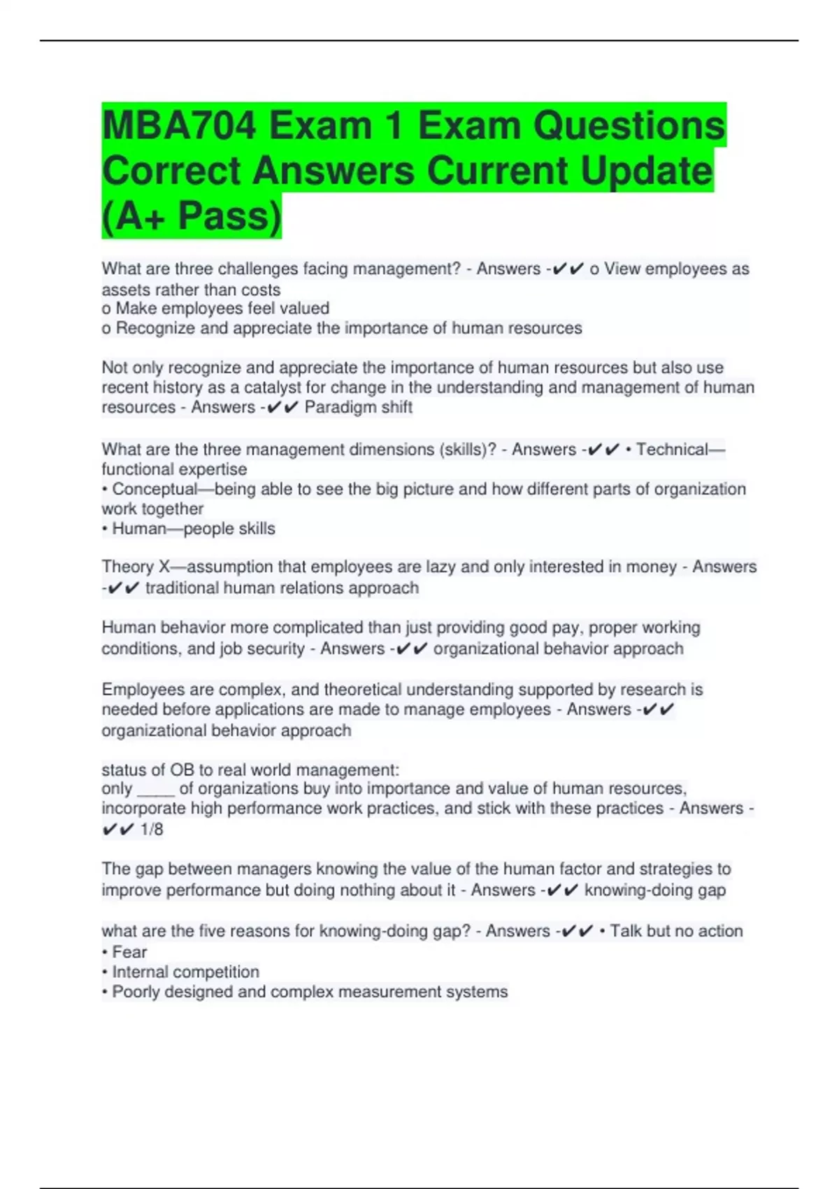 MBA704 Exam 1 Exam Questions Correct Answers Current Update (A+ Pass) What are three challenges facing management? - Answers - o View employees as assets rather than costs o Make employees feel valued o Recognize and appreciate the importance of human resources Not only recognize and appreciate the importance of human resources but also use recent history as a catalyst for change in the understanding and management of human resources - Answers - Paradigm shift What are the three management dimensions (skills)? - Answers - • Technical—functional expertise • Conceptual—being able to see the big picture and how different parts of organization work together • Human—people skills Theory X—assumption that employees are lazy and only interested in money - Answers - traditional human relations approach Human behavior more complicated than just providing good pay, proper working conditions, and job security - Answers - organizational behavior approach Employees are complex, and theoretical understanding supported by research is needed before applications are made to manage employees - Answers - organizational behavior approach status of OB to real world management: only ____ of organizations buy into importance and value of human resources, incorporate high performance work practices, and stick with these practices - Answers - 1/8 The gap between managers knowing the value of the human factor and strategies to improve performance but doing nothing about it - Answers - knowing-doing gap what are the five reasons for knowing-doing gap? - Answers - • Talk but no action • Fear • Internal competition • Poorly designed and complex measurement systems • Reliance on precedent • Use hard facts and empirical evidence to make decisions • Make organizational decisions informed by social science and organizational research - Answers - evidence-based management • Move decisions away from personal preference and unsystematic experience toward those based on the best available scientific evidence • Satisfies the need to refocus management education based on valid theory and research, translated for effective practice - Answers - evidence-based management • Beginning of the systematic study and understanding of organizational behavior - Answers - hawthorne studies what's a list of the four hawthorne studies - Answers - -illumination studies -relay room study -bank wiring room study -hawthorne effect • Effect of light intensity on employee productivity • Productivity increased even at moonlight level - Answers - illumination studies • Effect of workday length, rest breaks, and pay on productivity • Productivity increased even when factors returned to normal - Answers - relay room study • Regular supervisors used; productivity decreased; output restricted by group members - Answers - bank wiring room study • Conclusion that increased productivity was due to special attention & interesting work in relay room study • Minimized effect of small groups and supervision - Answers - hawthorne effect what are the five scientific perspective rules? - Answers - • Purpose—understanding, prediction, and control • Definitions—precise and operational • Measures—reliable and valid • Methods—systematic • Results—cumulative • Why something occurs • Allows the researcher to deduce logical propositions or hypotheses that can be tested by acceptable research designs - Answers - theory • Primary aim of any ____ is to establish a cause-and-effect relationship • Survey Studies • Case Studies - Answers - research design • Manipulation of independent variables to measure their effect on, or the change in, dependent variables, while everything else is held constant or controlled - Answers - experimental design ____ validity exists if there are no plausible alternative explanations of the reported results other than those reported - Answers - internal ____ validity exists if the results are applicable to a wide range of people and situations - Answers - external • The understanding, prediction, and management of human behavior in organizations - Answers - organizational behavior what are the three ob theoretical frameworks - Answers - cognitive, behavioristic, and social cognitive Gives humans credit and assumes that behavior is purposeful and goal oriented - Answers - cognitive (theoretical framework) States that behavior is a function of its contingent environmental consequences; cognitions are not needed - Answers - behavioristic (theoretical framework) Acknowledges human cognitions and environment role in behavior; says that cognitions, environment, and behavior interact and determine each other - Answers - social cognitive (theoretical framework) • Organizational behavior results from the reciprocal interaction among the unique personality characteristics of organizational participants, organizational environment factors such as supervisor recognition or pay for performance, and the organizational behavior itself - Answers - social cognitive theory what are the four reasons for cross-cultural complexity? - Answers - • People are influenced by multiple cultures (national, regional, organizational, functional, and professional) • People from same country have different values, beliefs, and behaviors • People may adjust their behaviors to deal with foreigners and not reflect their own culture • Simple cultural categorizations (e.g.--time important to Americans) may not be good predictors of behavior
