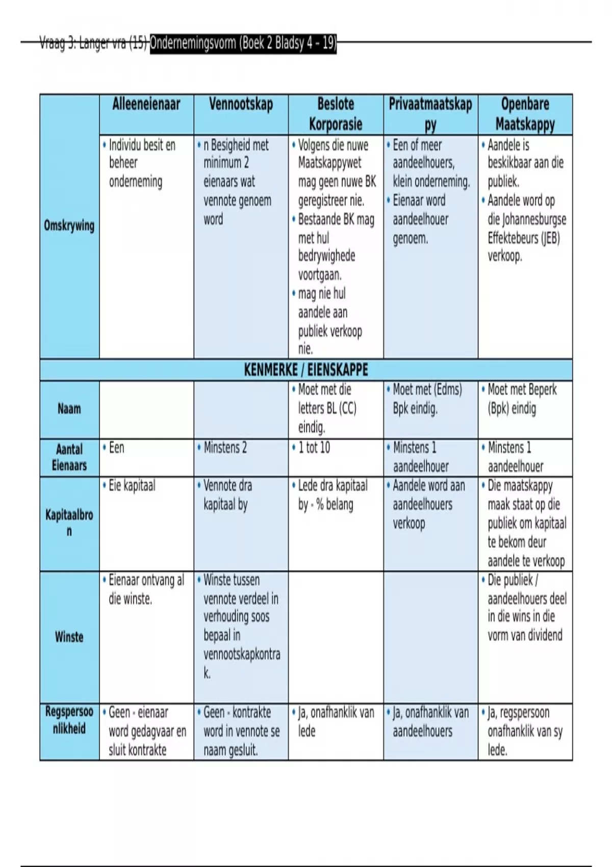 , Vraag 3: Langer vra (15) Ondernemingsvorm (Boek 2 Bladsy 4 – 19)