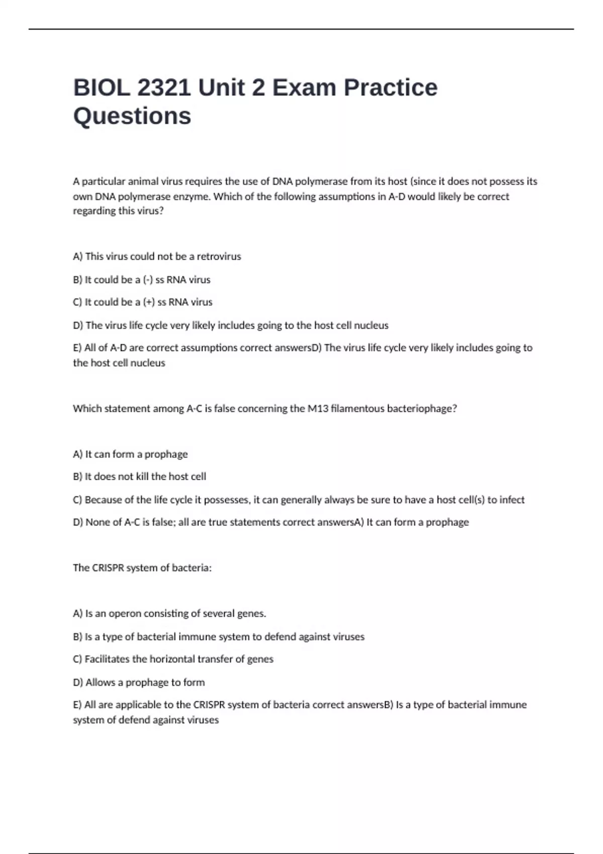 A particular animal virus requires the use of DNA polymerase from its host (since it does not possess its own DNA polymerase enzyme. Which of the following assumptions in A-D would likely be correct regarding this virus? A) This virus could not be a retrovirus B) It could be a (-) ss RNA virus C) It could be a (+) ss RNA virus D) The virus life cycle very likely includes going to the host cell nucleus E) All of A-D are correct assumptions correct answersD) The virus life cycle very likely includes going to the host cell nucleus Which statement among A-C is false concerning the M13 filamentous bacteriophage? A) It can form a prophage B) It does not kill the host cell C) Because of the life cycle it possesses, it can generally always be sure to have a host cell(s) to infect D) None of A-C is false; all are true statements correct answersA) It can form a prophage The CRISPR system of bacteria: A) Is an operon consisting of several genes. B) Is a type of bacterial immune system to defend against viruses C) Facilitates the horizontal transfer of genes D) Allows a prophage to form E) All are applicable to the CRISPR system of bacteria correct answersB) Is a type of bacterial immune system of defend against viruses