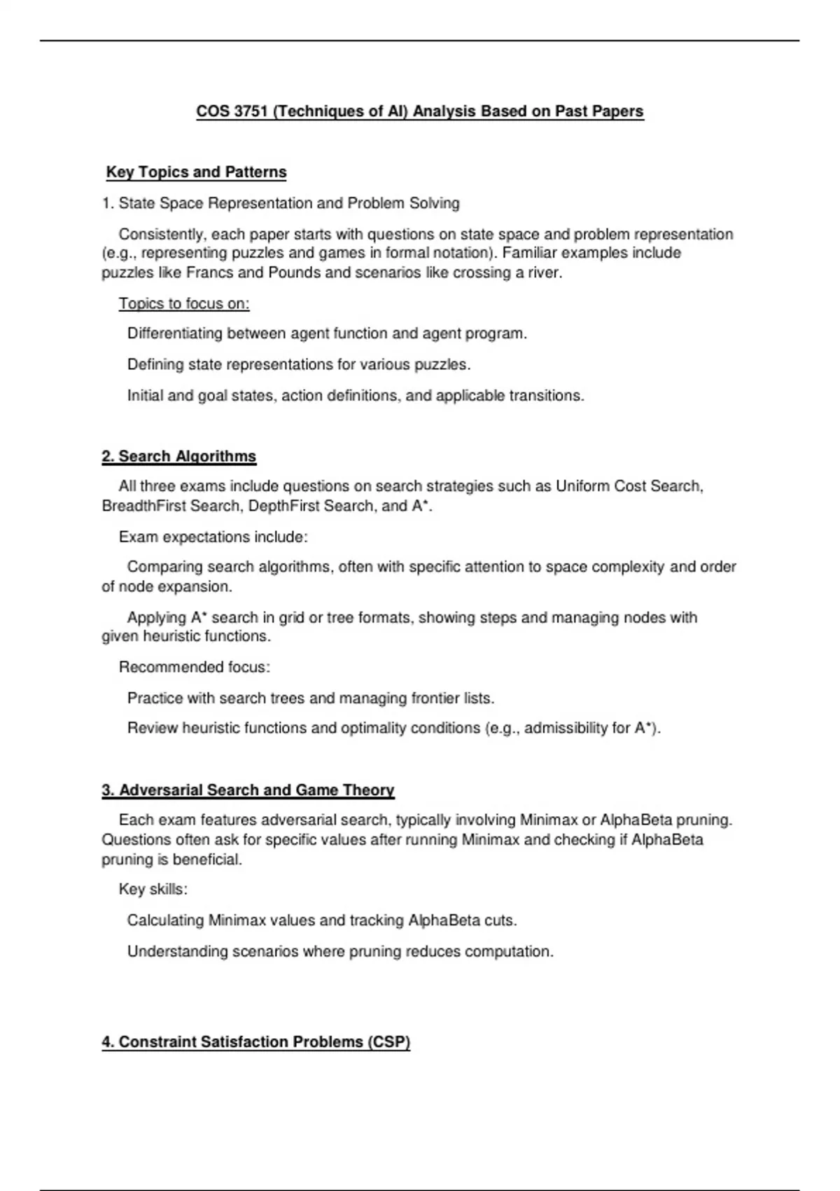 For the price of a cup of coffee, these notes will help you cut through the complexity of COS3751 and focus on exactly what you need to ace the exam. With concise explanations, step-by-step problem-solving, and insights from past papers, you’ll save time, reduce stress, and go into the exam with confidence. Don’t just study—master the material and get the edge you need to succeed. 1. Strategic Focus on Key Exam Topics: These notes are structured around the most heavily weighted exam areas—like state space representation, search algorithms, adversarial search, and decision trees—allowing you to target exactly what the exams consistently prioritize. This focus ensures that your study time is spent on high-impact areas, significantly boosting your efficiency. 2. Practical, Step-by-Step Guidance: With these notes, you don’t just learn theory; you understand how to apply it through practical examples and structured problem-solving. For instance, they guide you through step-by-step calculations in A* search or Minimax and Alpha-Beta pruning. This makes tackling multi-step questions straightforward and maximizes your ability to secure marks. 3. Clarity on Complex Topics: Challenging AI concepts, like constraint satisfaction, predicate logic, and information gain, are broken down into simple, digestible explanations. These notes demystify the toughest topics, helping you build a solid understanding quickly and avoid common pitfalls that many students face. 4. Time-Efficient and Stress-Reducing: By having a focused study plan, you save hours of sifting through dense material. The notes lay out exactly what you need to know and how to tackle it, reducing the stress of wondering if you’ve covered everything and allowing you to study with confidence. 5. Built on Proven Patterns from Past Papers: This study strategy is informed by thorough analysis of multiple past exams, meaning it covers the essential themes and question types that consistently appear. By following this strategy, you’re preparing directly for the exam’s format and recurring content, giving you a clear advantage.