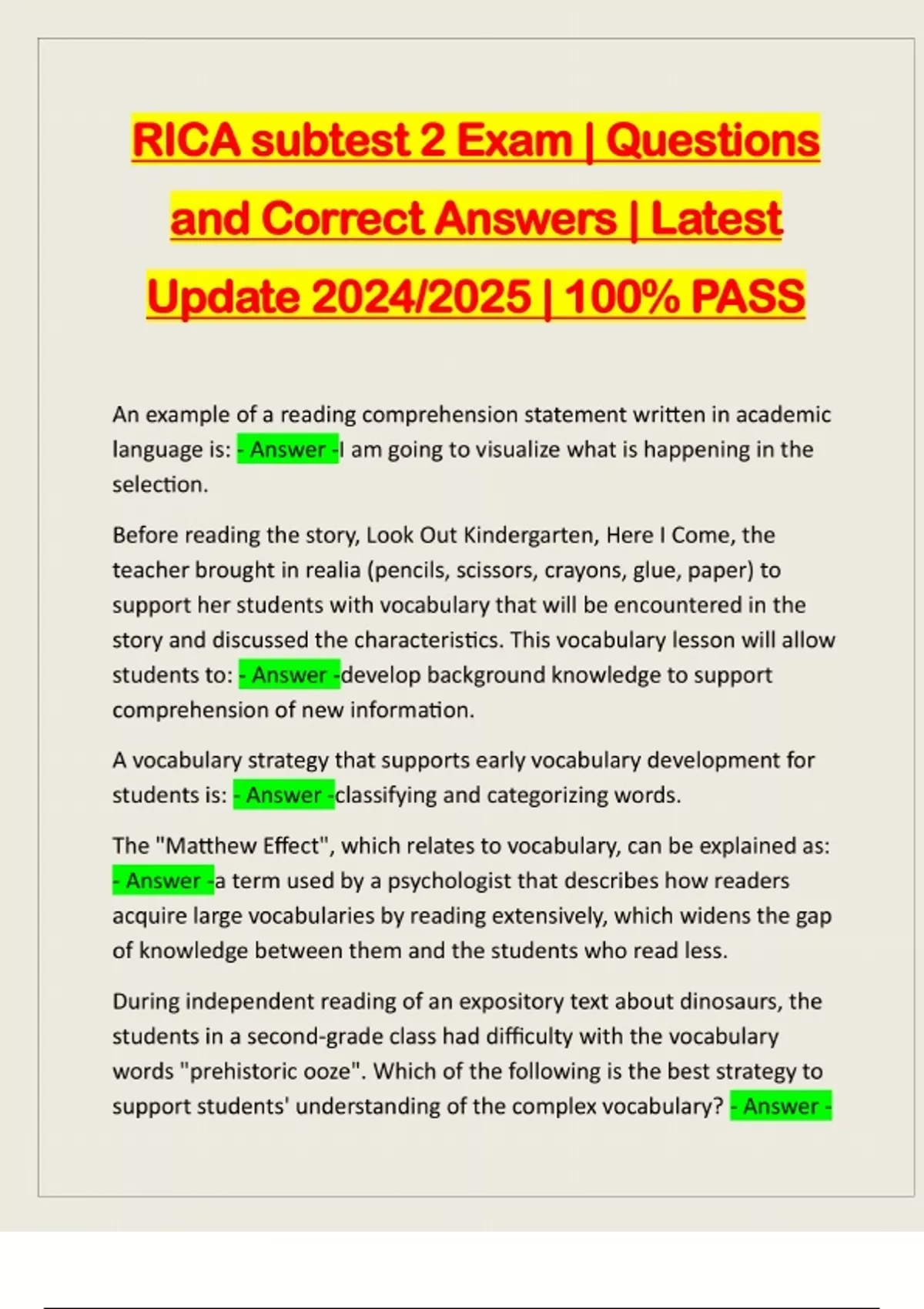RICA subtest 2 Exam | Questions and Correct Answers | Latest Update 2024/2025 | 100% PASS An example of a reading comprehension statement written in academic language is: - Answer -I am going to visualize what is happening in the selection. Before reading the story, Look Out Kindergarten, Here I Come, the teacher brought in realia (pencils, scissors, crayons, glue, paper) to support her students with vocabulary that will be encountered in the story and discussed the characteristics. This vocabulary lesson will allow students to: - Answer -develop background knowledge to support comprehension of new information. A vocabulary strategy that supports early vocabulary development for students is: - Answer -classifying and categorizing words. The "Matthew Effect", which relates to vocabulary, can be explained as: - Answer -a term used by a psychologist that descri