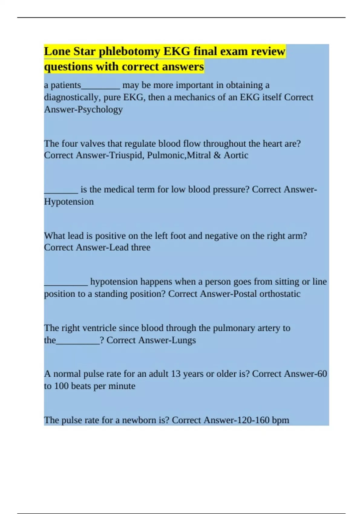 Lone Star phlebotomy EKG final exam review questions with correct answers