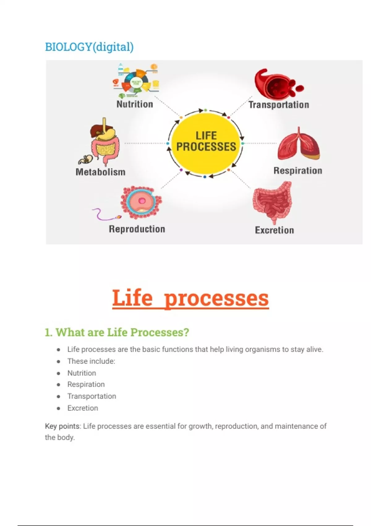 Key points: Life processes are essential for growth, reproduction, and maintenance of